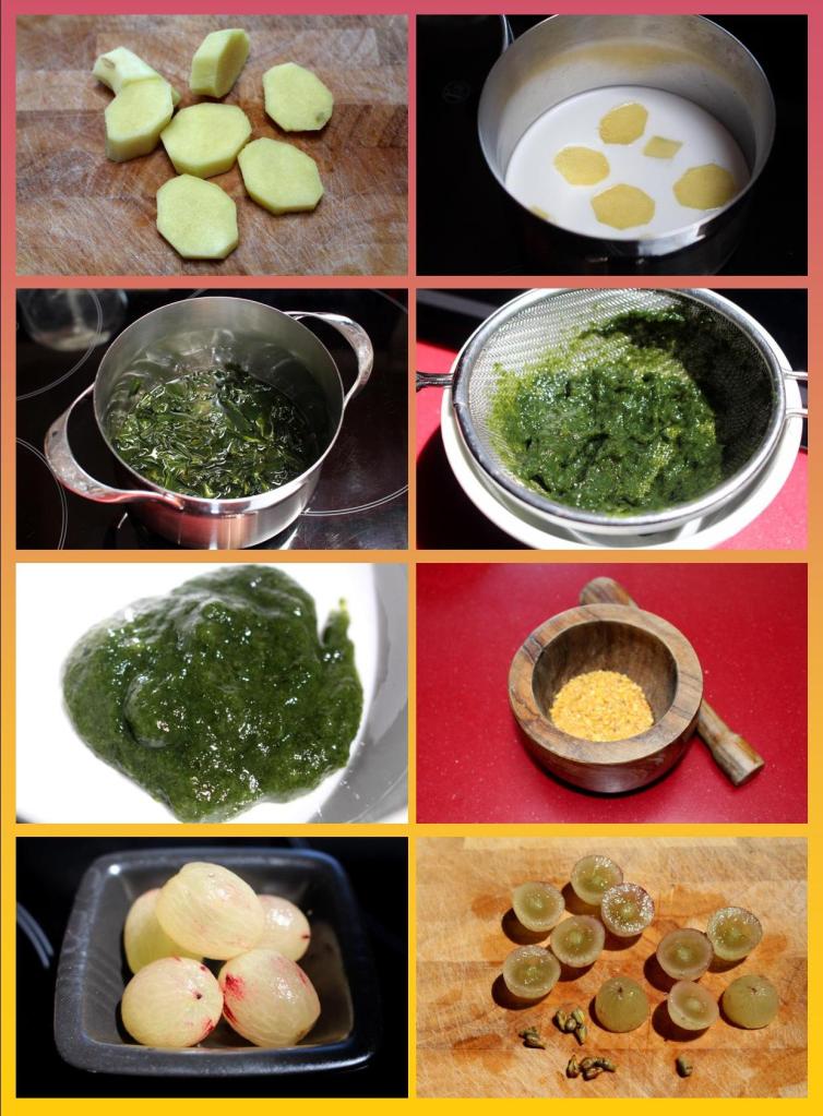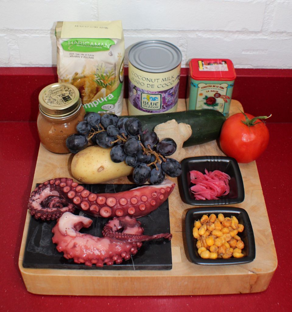 1 tentáculo grueso de pulpo, 1 tomate, 1 pepino, 1 trozo de jengibre fresco, 1 patata, 100ml de leche de coco, 10grs de alga wakame deshidratada, 20grs de maíz tostado, uvas negras, cebolla morada encurtida, pulpa de tamarindo, harina de tempura, pimentón picante, coco rallado, agua, aceite de girasol y sal.