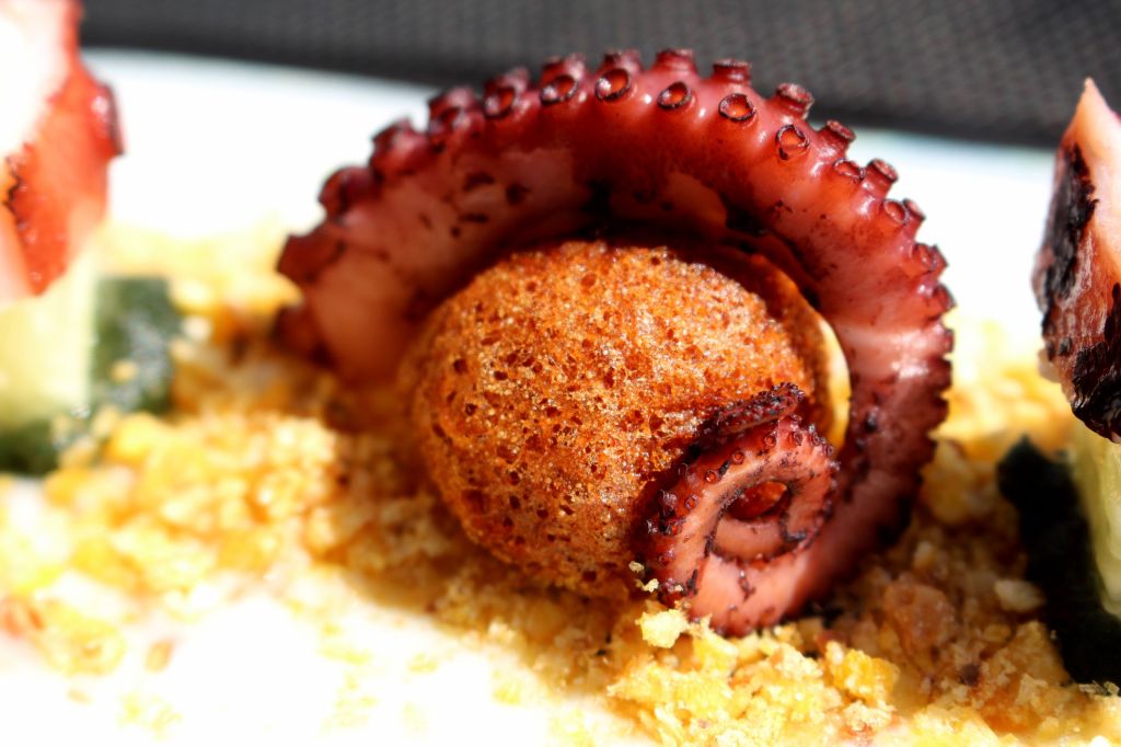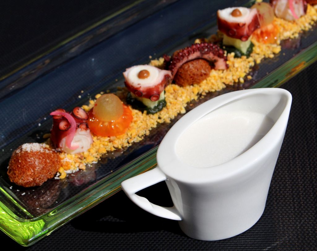Aunque el plato está muy asiatizado, no pierde su parte patria del popular pulpo a la gallega. La patata y el pimentón picante lo he incorporado en unas bolas de patata cocida que he tempurizado, mezclando el pimentón con la harina y el agua.