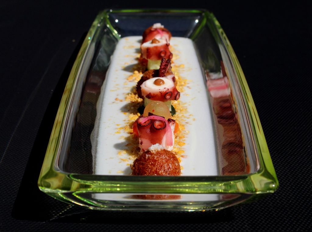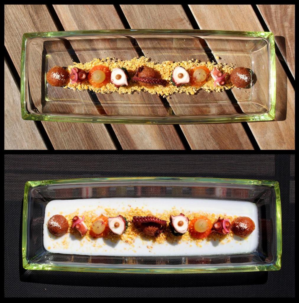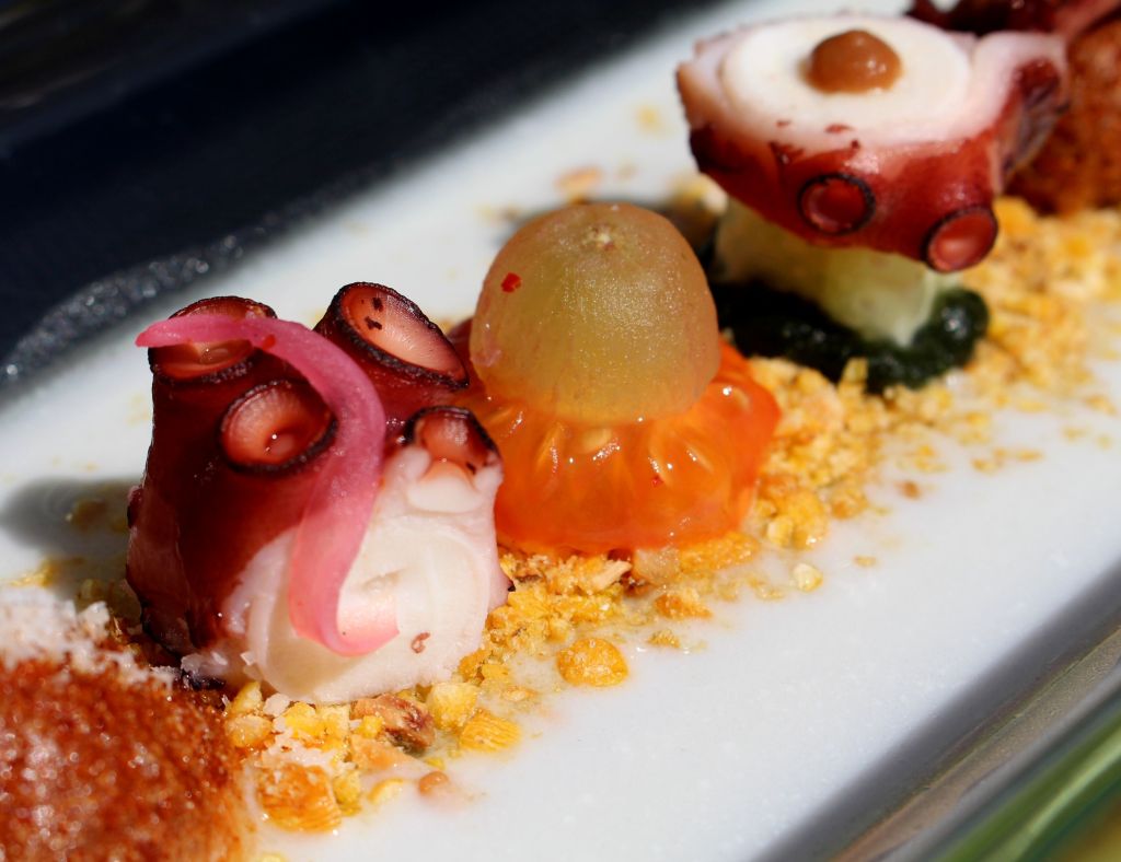 Seguí con las bolas de patata, una al centro y otra a cada extremo con un poco de coco rallado. Los huecos empece rellenando en el centro con el tomate y la uva, a cada lado un trozo de pulpo, uno en vertical con la cebolla encurtida y otro en horizontal apoyado sobre el pepino que había anclado con la pasta de wakame, coronamos con una gota grande de pulpa de tamarindo. En la patata del centro abracé la punta del tentáculo.