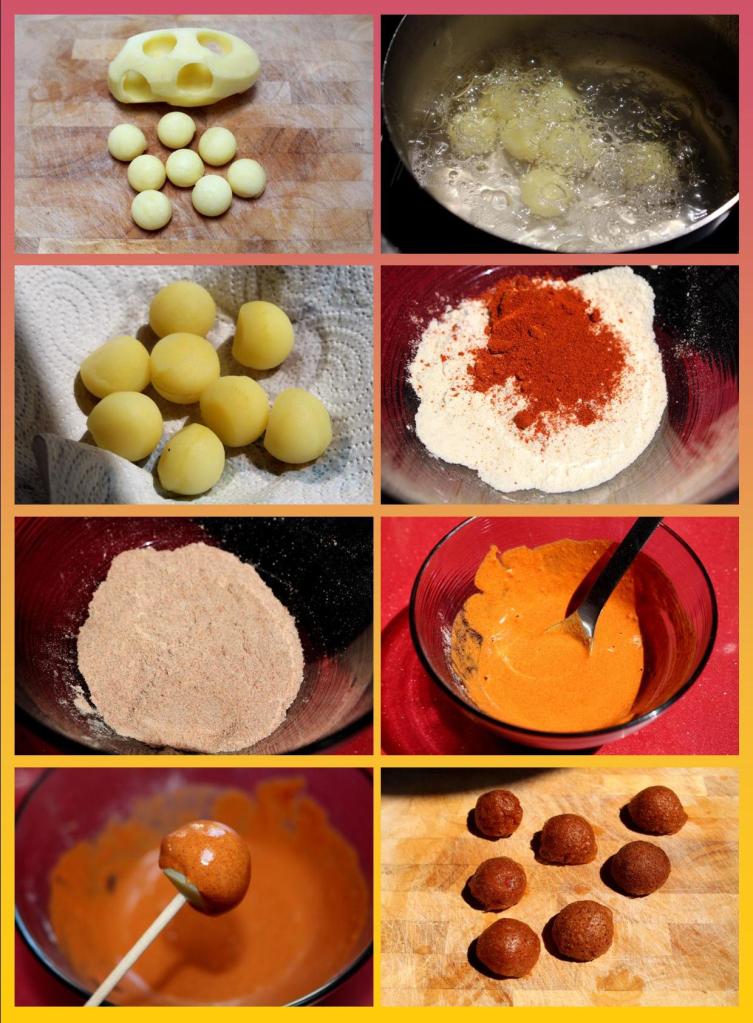 Mezclamos harina de tempura con pimentón picante, hay que ser generoso con el pimentón. Añadimos agua bien fría poco a poco según necesitemos hasta la obtención de una crema densa. Con un palillo largo pinchamos las bolas por la base teniendo cuidado de no atravesarlas por completo, remojamos en la tempura dejando libre la base, giramos el palillo como quien hace una bolita de plastilina con dos dedos para que recuda los excesos. Freímos en el aceite bien fuerte un par de segundos sosteniéndolas con el palillo, colocamos sobre papel absorbente.
