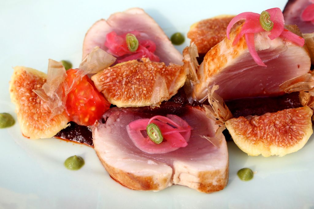 Ahora sólo queda montar el plato. Yo elegí uno alargado para poner en el centro y a lo largo una generosa cantidad de mole. Montados por una esquina sobre el mole, dos rodajas de bonito recostadas y enfrentadas a cada lado, en el centro una en vertical. Cubrimos huecos con los gajos de higo, el tomate en las esquinas, puntos de crema de pimiento guardando simetría, cebolla encurtida sobre el bonito contrastando con el verde de la cebolleta y rematamos con el katsuobushi aleatoriamente.