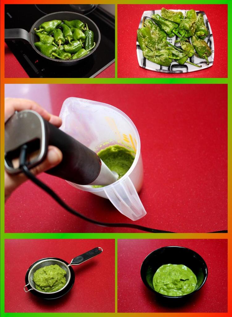 Lo primero será hacer una crema de pimientos del Padrón friéndolos sin que queden chamuscados. Retiramos el rabo y trituramos con la batidora, pasamos por un colador de rejilla para eliminar las pieles y pepitas, salamos y reservamos.
