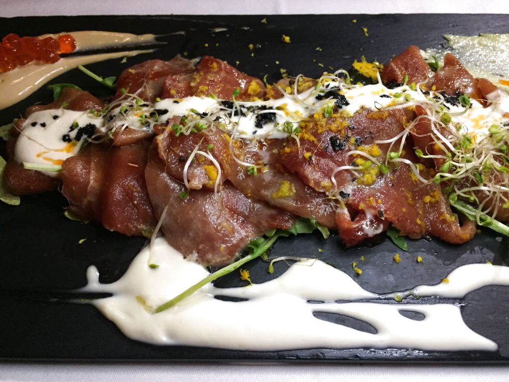 Como platos principales nos inclinamos por el ceviche de atún. Aunque estaba sabroso, creo que en el plato hay un exceso de emulsiones y aditamentos que enmascaran el marinado del atún, la de lima, de AOVE, un wasabi, las huevas, la piel de naranja…etc.