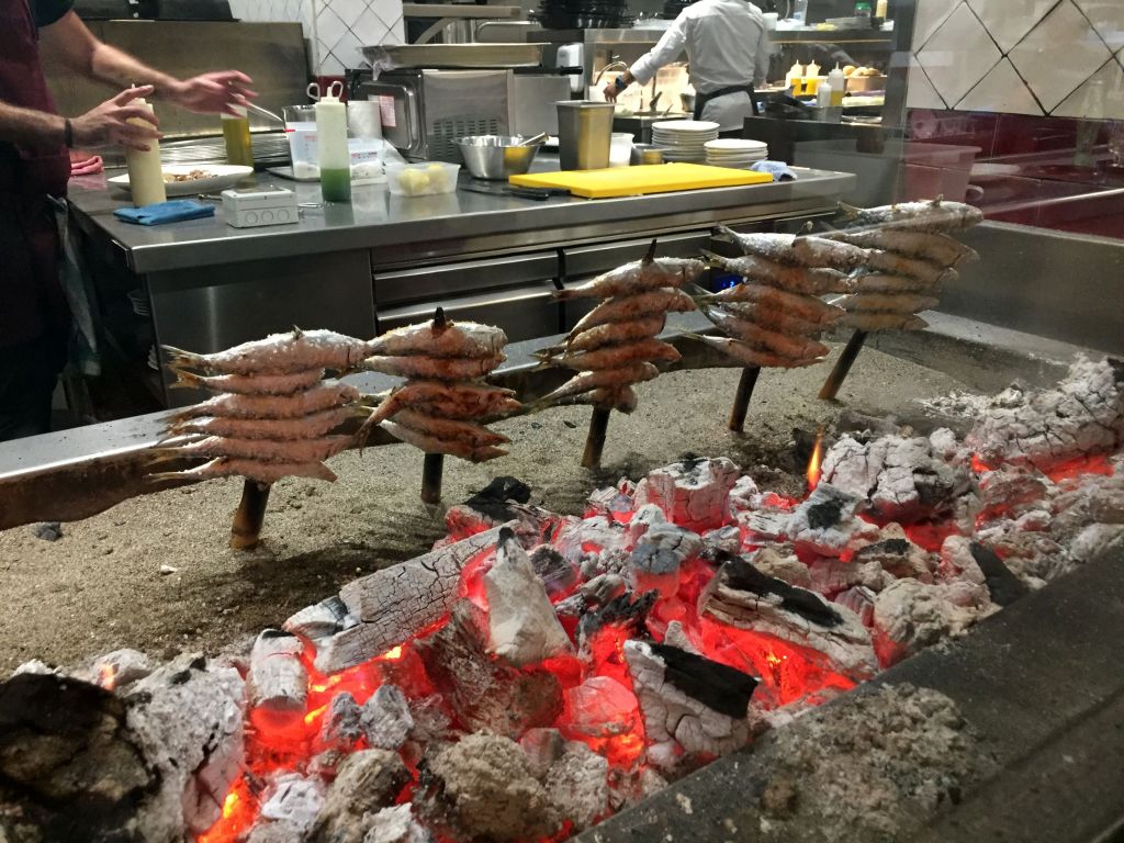 Entre esas técnicas renovadas de las que os he hablado, se encuentran los espetos horizontales. Boquerones, jureles y salmonetes de roca tendidos y prendidos por la cabeza para cocinarlos casi intactos a la lumbre de unas brasas de olivo.