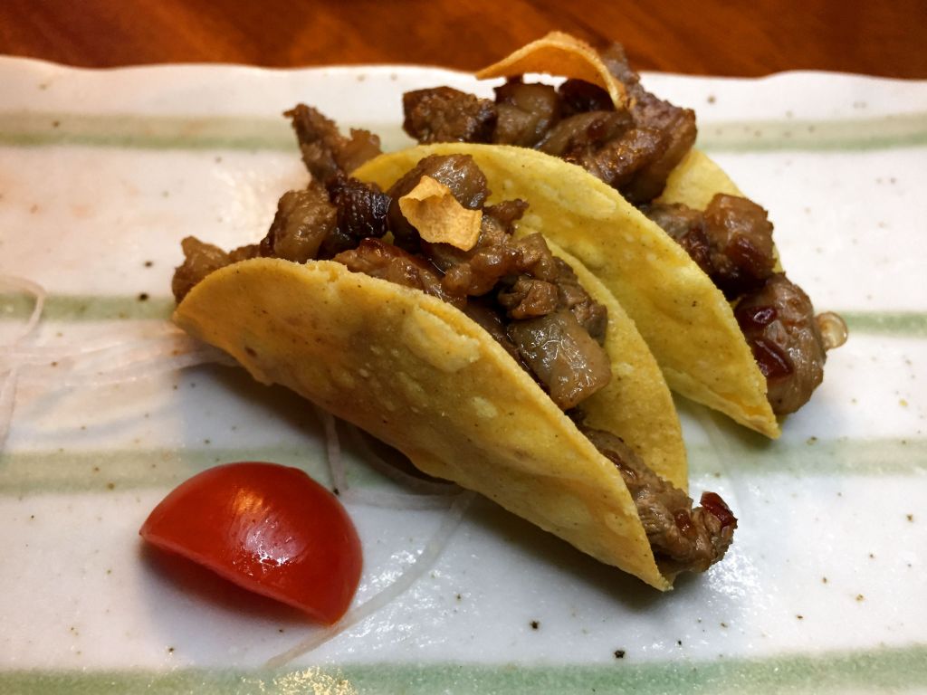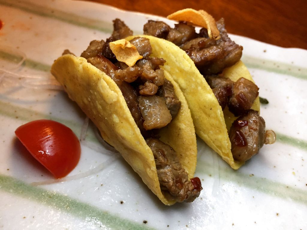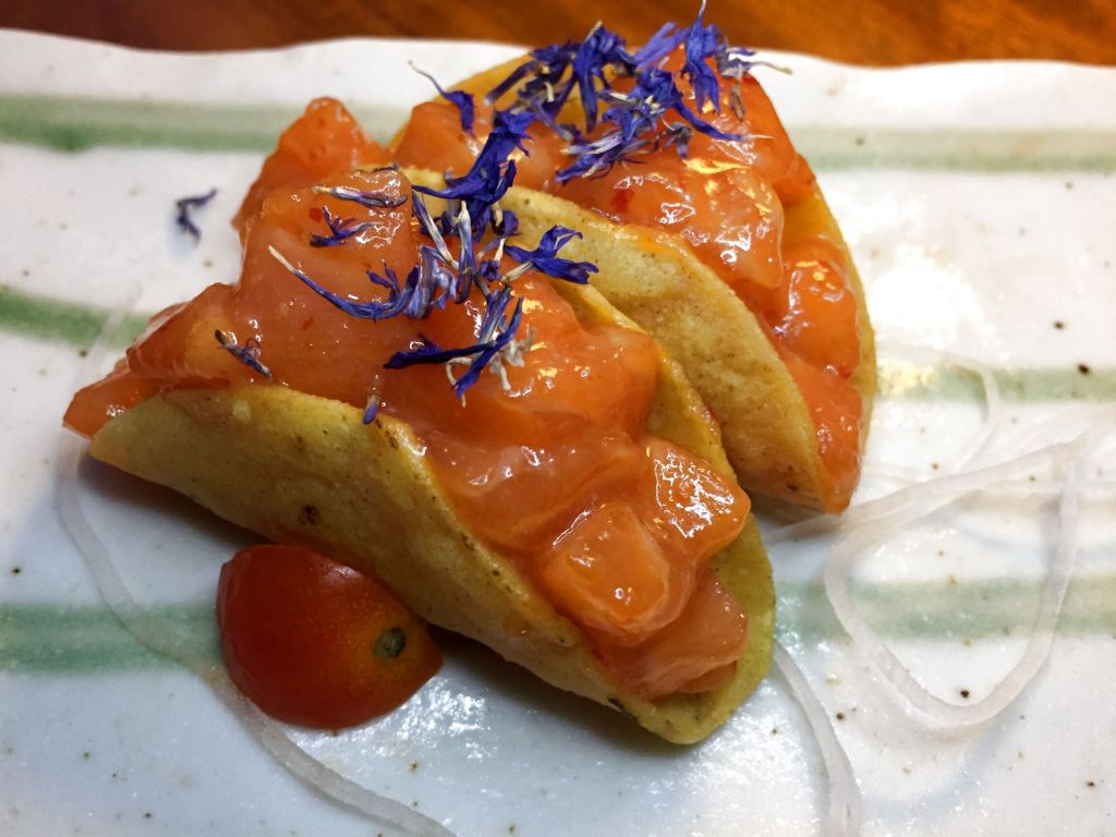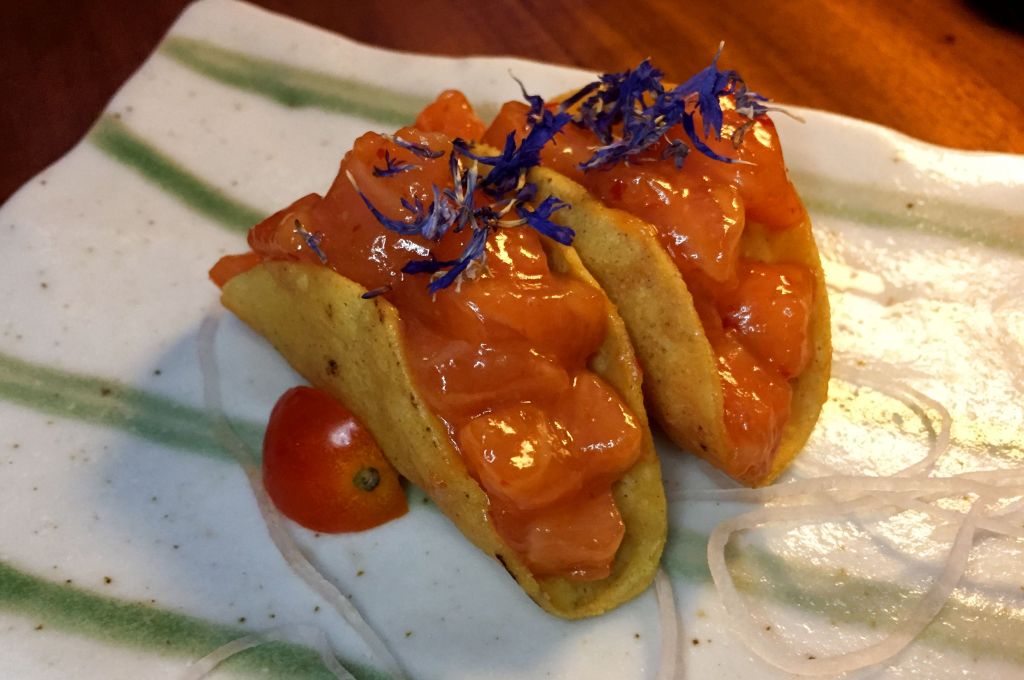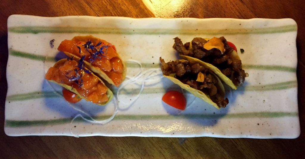 Comenzamos con unos tacos de sashimi al estilo Nobu, el de salmón con miso picante y el de wagyu con salsa ponzu picante. Excelente bocado, literal, con ese tamaño va todo de una sentada.