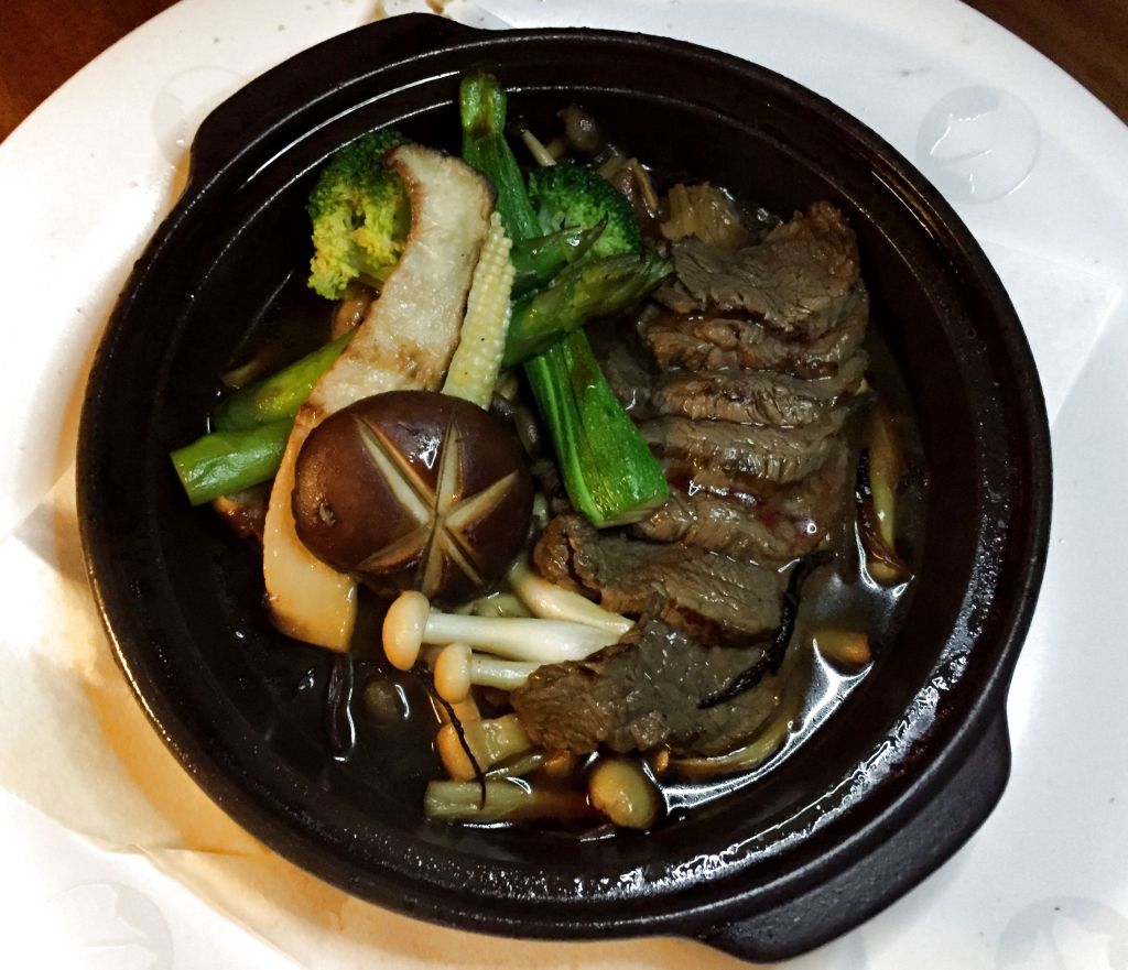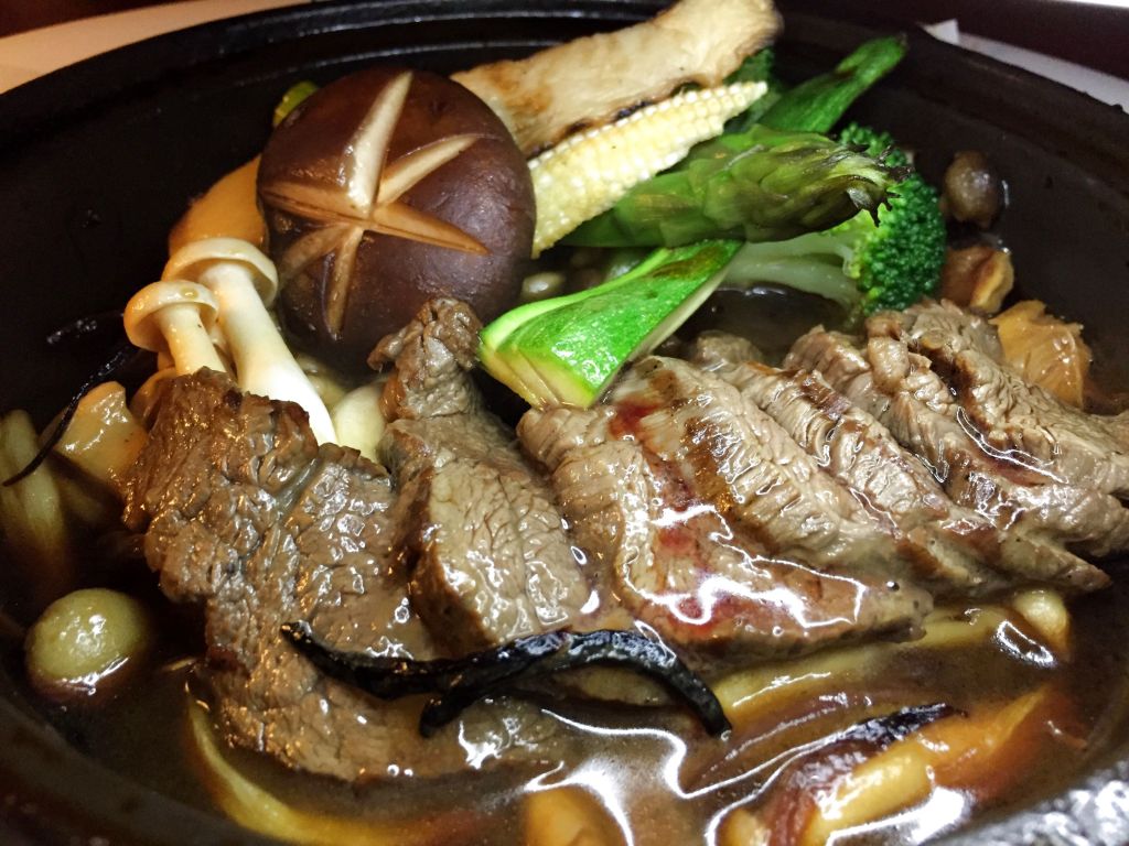Rematamos con algo que debería ser más contundente, aunque ya sabemos que el japones no es excesivo en su gastronomía. Un toban-yaki de ternera con setas y verduras para el que incorpora una salsa de sake, yuzu y soja. Se trata de una sabrosa elaboración hecha en ese plato cerámico, cuidado de no quemarse.