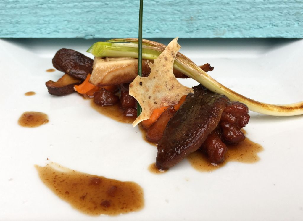 Setas shiitake de roble con mollejas glaseadas al PX y un puré de zanahoria asada es un plato que nos recordaba el comienzo del otoño, colorido y sabroso.