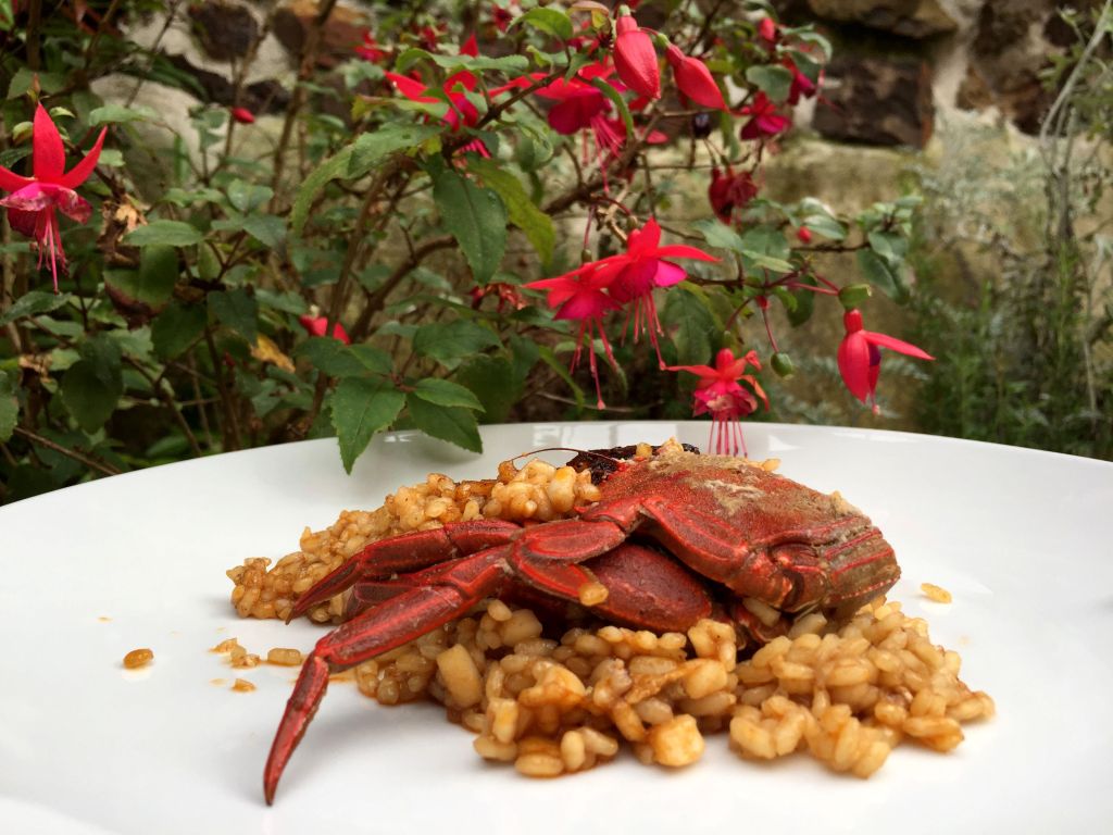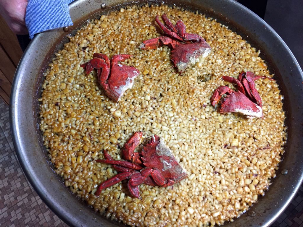 El plato principal fue un abundante arroz seco con calamar y andaricas (nécoras) de Tazones. Rasca que te rasca, el socarrat y el punto óptimo del arroz nos puso como motos, sólo por este arroz ya merecía la pena la visita.