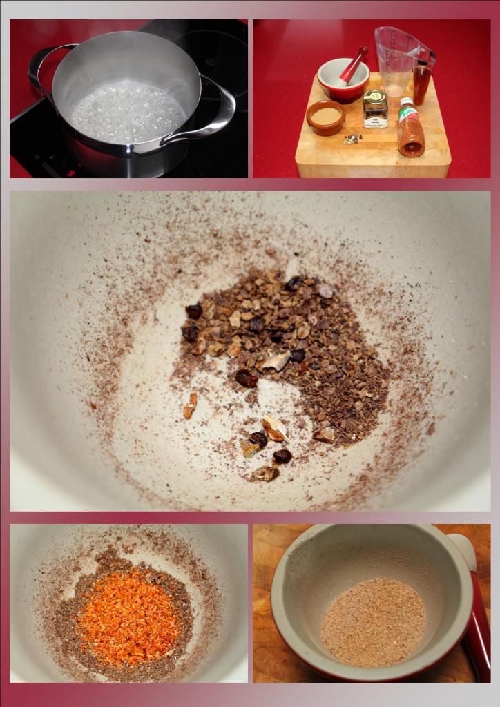 Con un mortero machacamos la pimienta y el cardamomo, añadimos el chile piquín, el azúcar moreno y diluimos con el vinagre de sidra. Incorporamos a la cacerola, le damos un hervor fuerte y bajamos a fuego lento durante una hora.