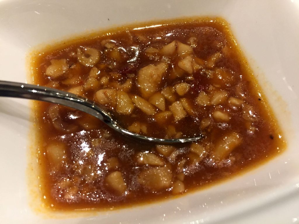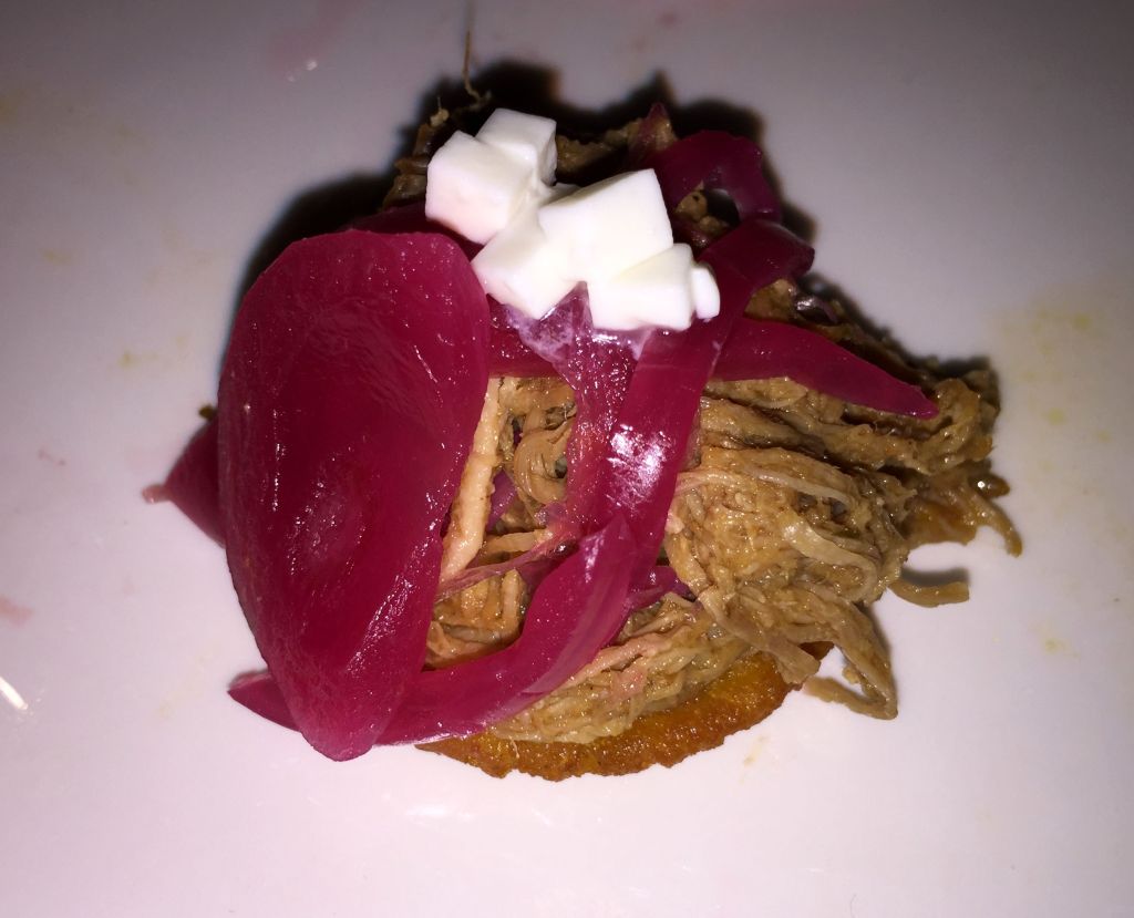 Papada de cerdo thai con penca de acelga y bigaros, chupito de carne de nécora con huevas de arenque, maki sushi de salmón y aguacate con salsa teriyaki, langostinos tigre con salsa de tamarindo y chipotle, callos de bacalao, torto de cochinita pibil con cebolla de tamarindo y croquetas de jamón.