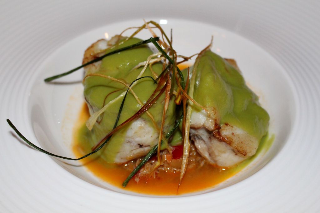Lomo de pixin con guiso de centollo, velouté de guisantes y crujiente.