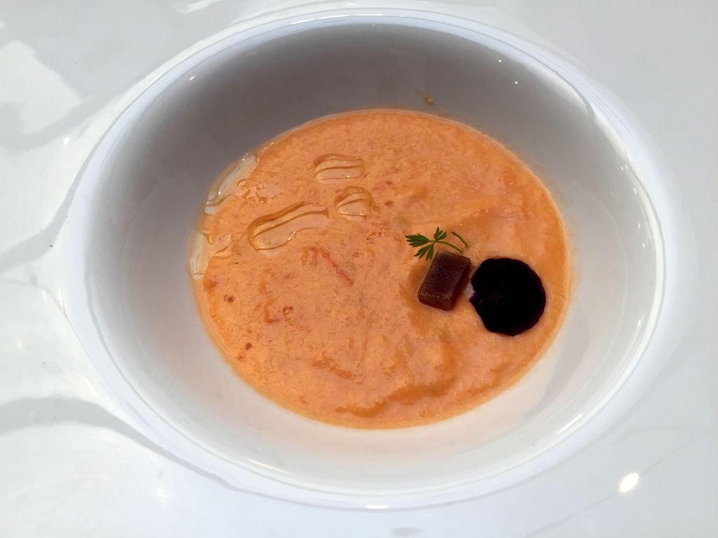 Como entrante de cortesía nos sirvieron un estupendo salmorejo aderezado con mojama de atún, una combinación muy acertada. Taquitos de jamón o atún en escabeche con huevo cocido son los acompañamientos más tradicionales.