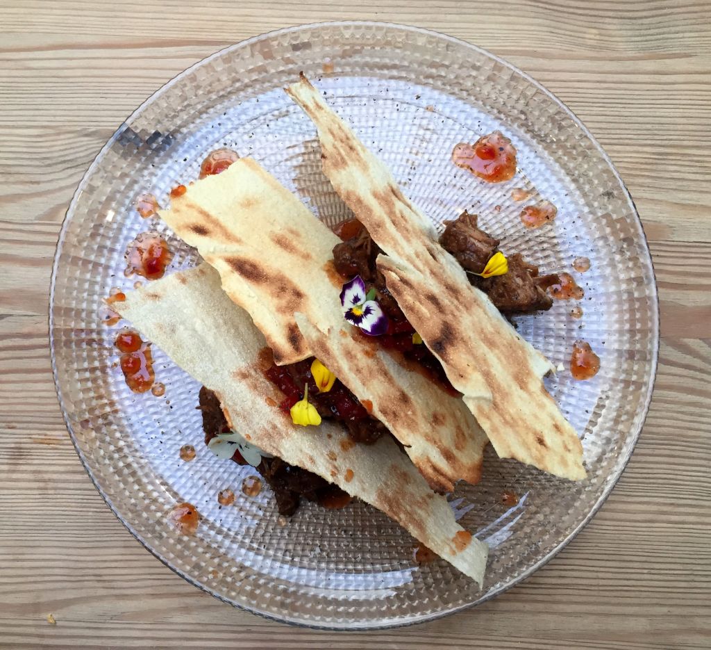 Seguimos con el original sandwich de carne gobernada con confitura de pimientos y pan de Carasau. Plato de cocina tradicional, con muy buen sabor y con una forma novedosa en su presentación y degustación. Este pan es típico de Cerdeña, también se le conoce como pan de pergamino sardo aunque el nombre carasau proviene de la «carasatura» una cocción doble que le confiere esa textura tan crujiente.