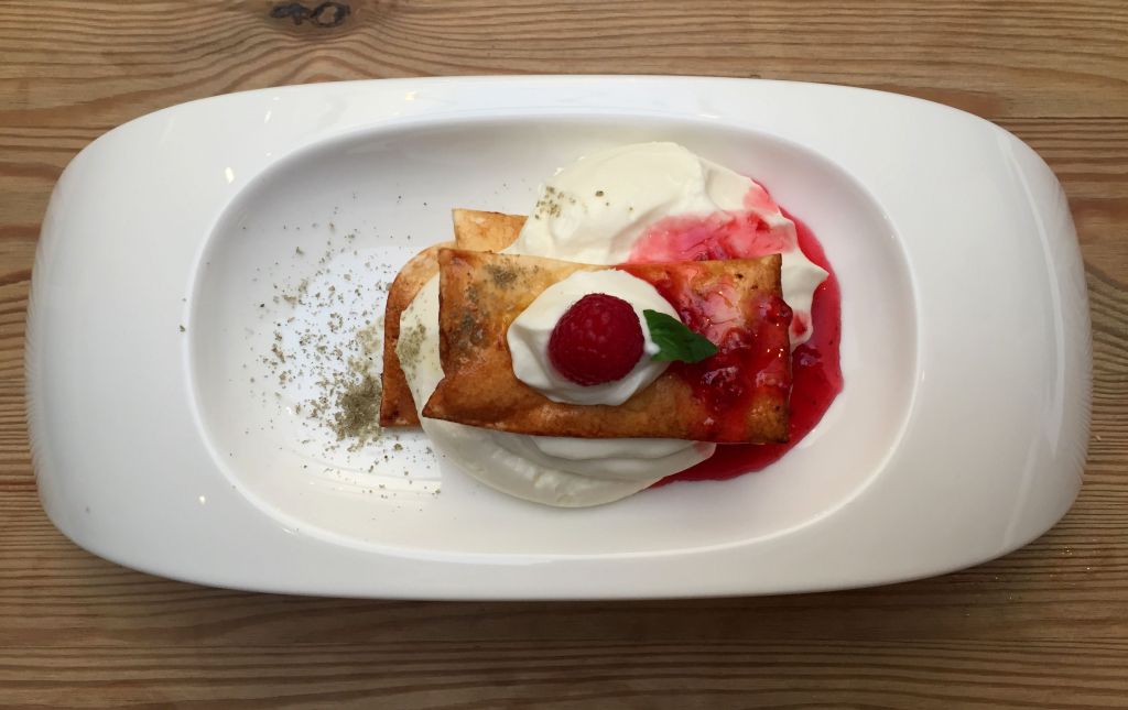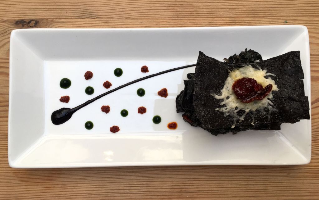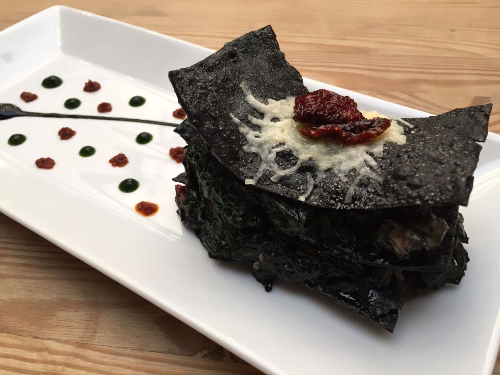 Lasaña negra con espinacas, pomodori secchi de Ravello, tinta de calamar y plancton marino. La pasta va frita y le aporta una textura crujiente muy divertida, los tomates secos en aceite realzan sabores y la tinta y plancton potencian un sabor marino que hace de esta lasaña un ejercicio de originalidad.