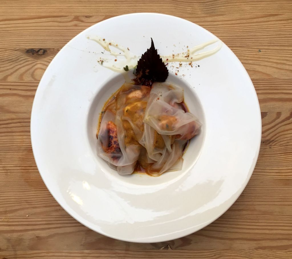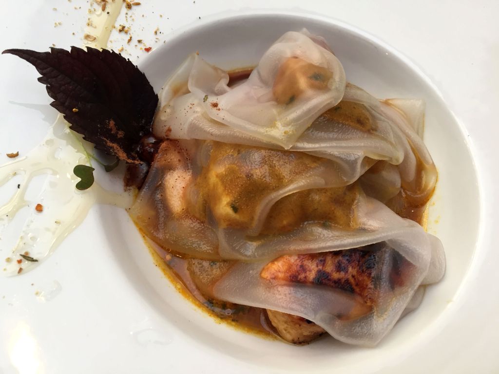 Finalizamos con un plato de sabores que nos trasladan al oriente asiático, se trata de un pollo al curry, con dulce de canela, espuma de cilantro y velo de arroz. El velo en si, al ser de arroz no aporta los sabores de otros velos como el de tocino pero el efecto visual es muy atractivo y está en sintonía con la temática del plato.