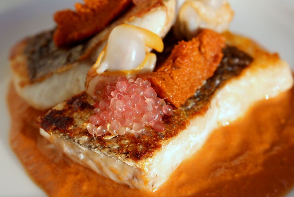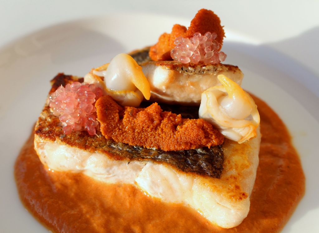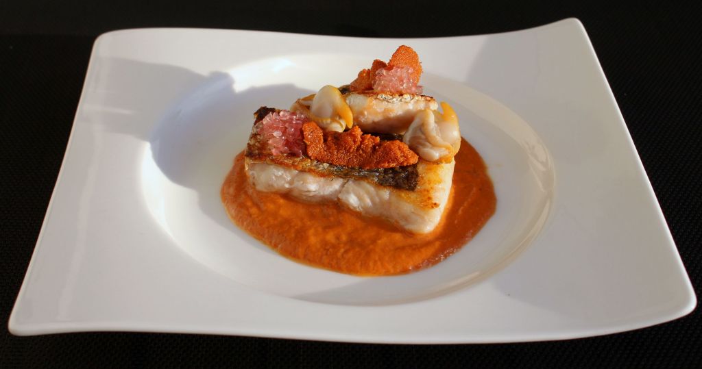 Ya tenemos todos nuestros componentes, toca emplatar. Ponemos un par de cucharadas de salsa de oricios en la base (llevaron tanto trabajo y está tan buena que pequé en cantidad, con menos hubiese quedado más elegante). Ponemos un trozo de merluza sobre la salsa y el otro lo colocamos al bies, con cuidado ubicamos las mejores piezas de oricio, los berberechos más gordos y un poco de caviar de lima.