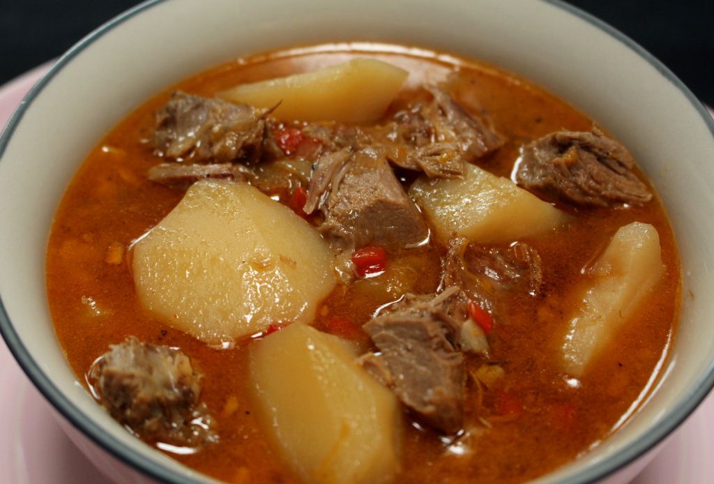 Cordero a la estaca (o en crudo), 1 cebolla, 1 pimiento rojo, 2 dientes de ajo, 4 patatas, 6 tamarillos o 2 tomates, 1 cucharada de Bovril (concentrado de buey), 2 litros de agua, salsa sriracha, AOVE y sal.