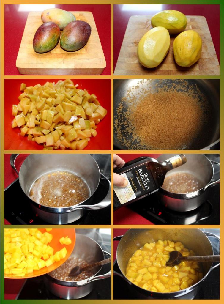 Pelamos y troceamos los mangos en cuadrados. En una cacerola ponemos ponemos el azúcar y el agua, llevamos a ebullición, incorporamos el ron, evaporamos y obtenemos un almíbar no muy denso al que añadiremos los mangos.