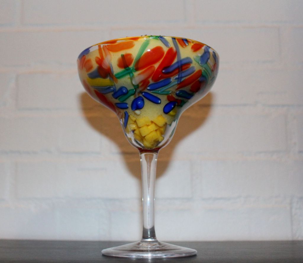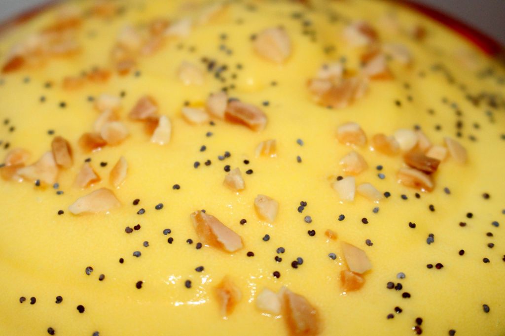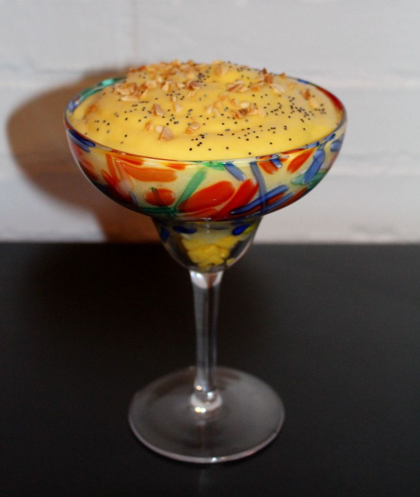 Cortamos un un trozo de mango en pequeños cuadraditos para depositar en el fondo de vuestra copa. Agitamos el sifón, probamos fuera de la copa, llenamos la copa y decoramos con el crocanti de almendra y las semillas de amapola.