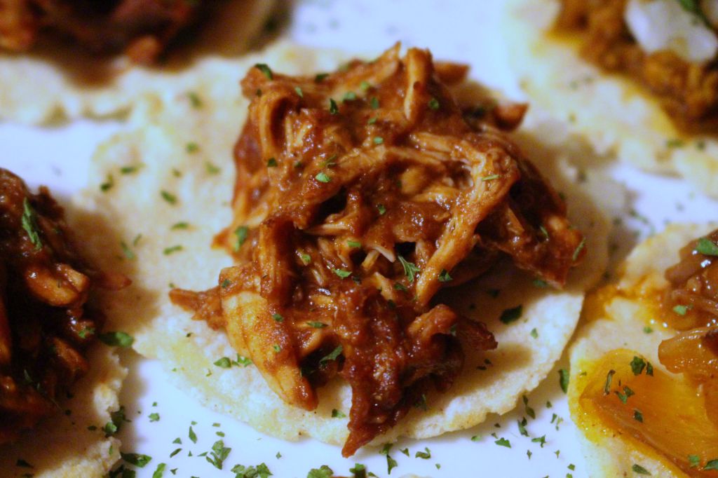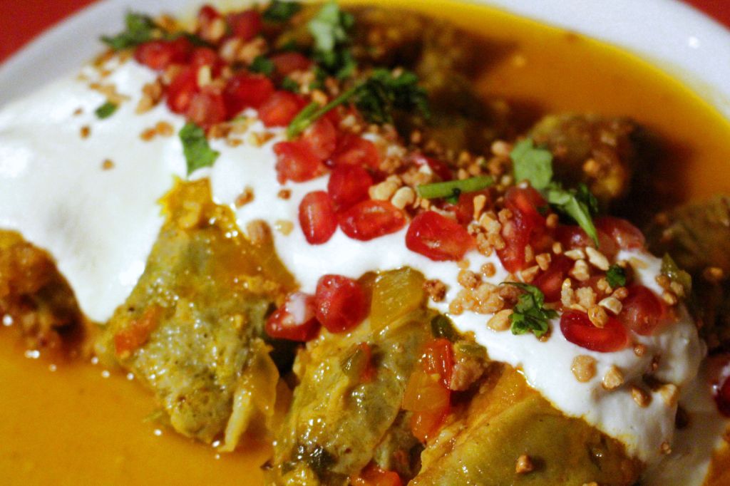 Seguimos con unas enchiladas de pollo con salsa verde. Las tortillas de maíz se remojan en la salsa con base de tomate verde y cilantro, se rellenan de pollo y por encima se cubren con queso.
