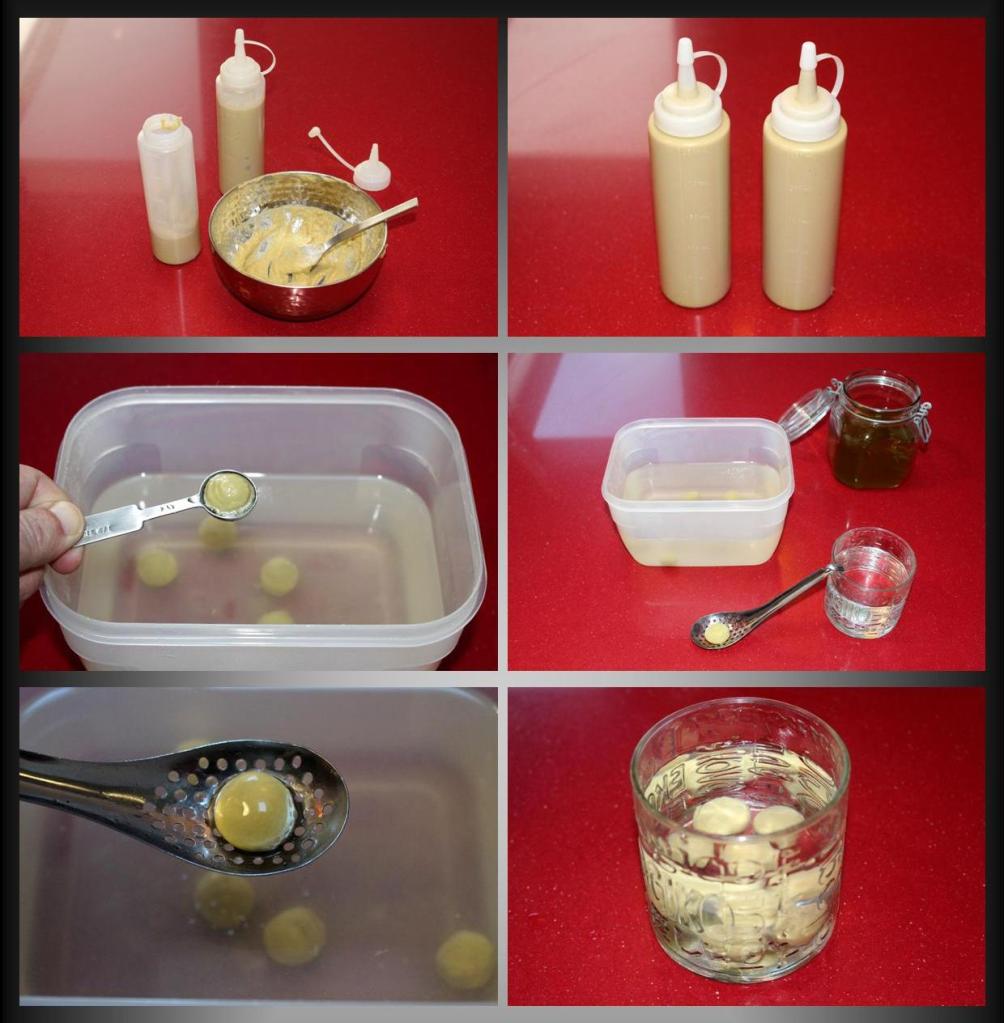 Llenamos un biberón. Sacamos de la nevera el alginato, en una cuchara medidora de 2,5ml (1/2 teaspoon) que remojamos en el alginato dejando un poco en la base, llenamos directamente desde el biberón, volcamos a la mezcla de alginato, mantenemos un par de minutos y con la cuchara perforada las rescatamos y pasamos a un vaso con agua fría para limpiarlas de restos de alginato, a continuación las introducimos en el tarro de aceite aromatizado hasta que vayamos a usarlas.