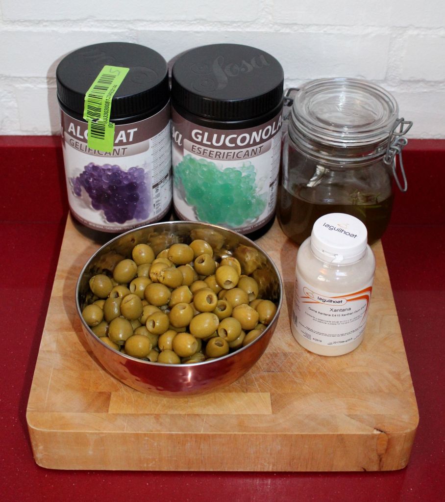 0,5kgs de aceitunas verdes sin hueso, 0,02kg de Gluconolactato, 0,001kg de goma xantana, 0,006kg de alginato, 1 litro de agua, 1 vaso de agua, romero en rama y AOVE.