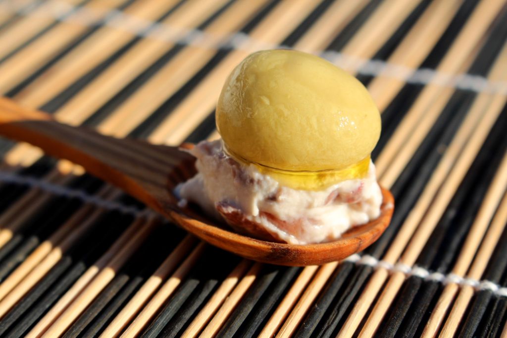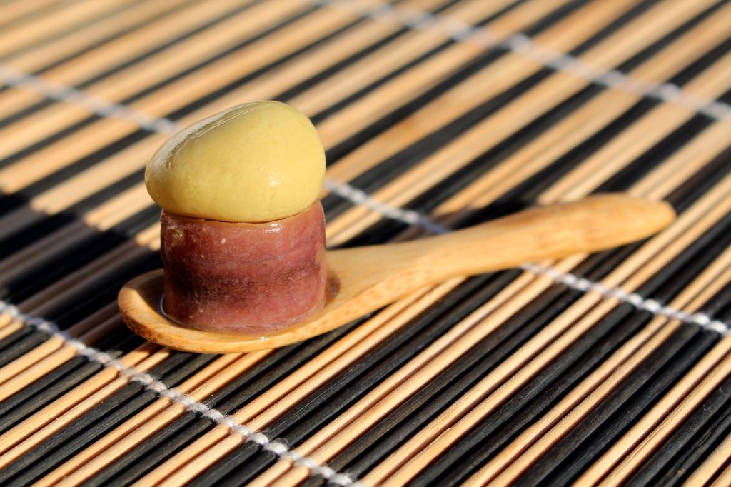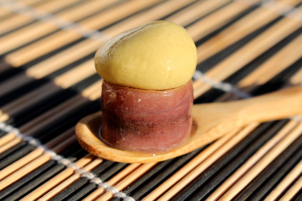 Podéis servirlas por si solas en una cucharilla, o integrarlas en cualquier otra receta. Yo os las muestro en diferentes aperitivos, sobre una base de mermelada de tamarillo, sobre una anchoa o con esa misma anchoa mezclada con un poco de crema de queso.