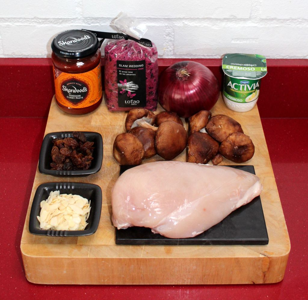 1 pechuga de pollo, 3cdas de pasta tandoori, 1 yogur ( en mi caso utilicé uno de lima limón), 200grs de arroz rosa Lotao, 1 cebolla morada, setas shiitake, almendra laminada, pasas sultanas, sal, agua y AOVE.