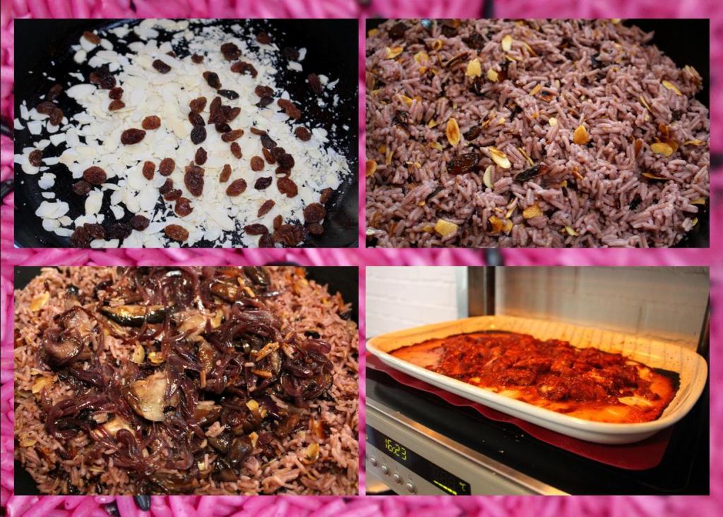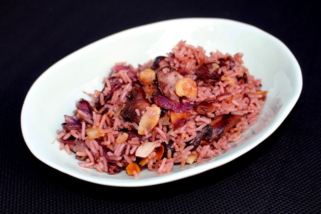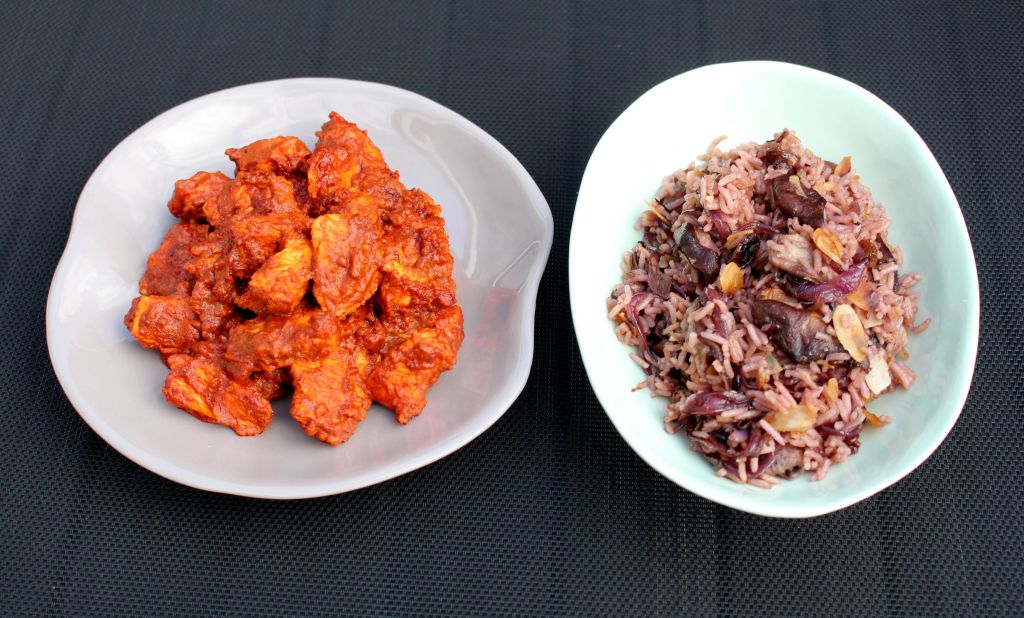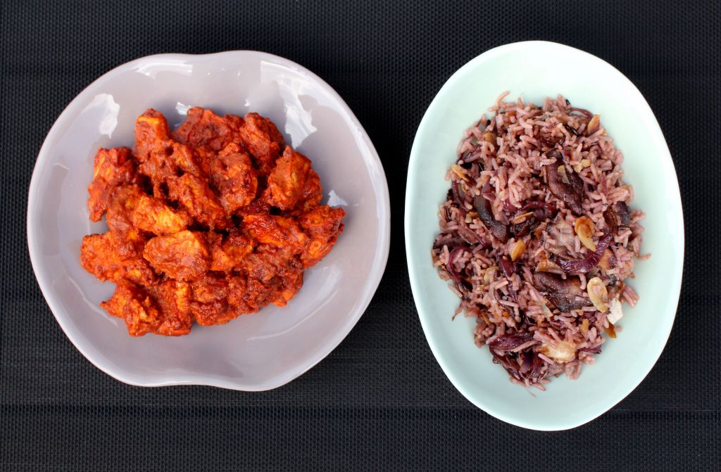 No contento con el llamativo color rojo, encontré la guarnición perfecta, se trata de un arroz rosa, que dicen de los amantes. Colorido como una boda de Bollywood, es sinónimo de felicidad, fertilidad y vitalidad.