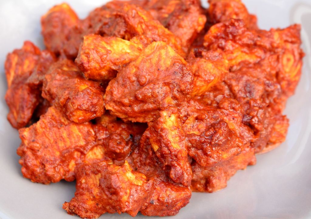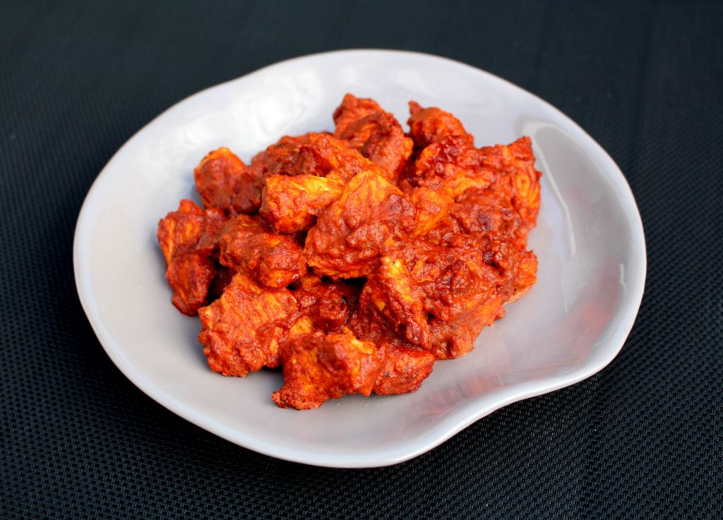 Quizás lo más llamativo de esta receta, es el característico color rojizo-anaranjado que adquieren todos aquellos ingredientes que sumergimos en el marinado de tandoori masala (especias diversas).