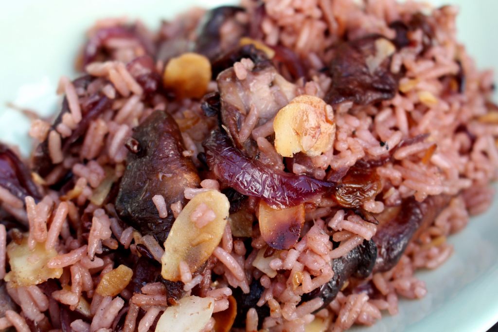 En la misma sartén doramos la almendra y las uvas pasas, añadimos el arroz para darle calor y tostarlo un poco. Finalmente le añadimos la mezcla de setas y cebolla. La guarnición ya está lista.
