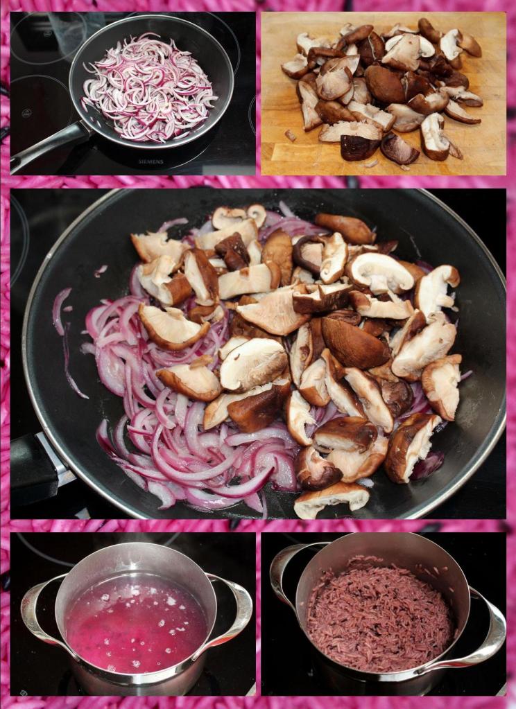 Mientras, cortaremos la cebolla en juliana y la pochamos en una sartén con un poco de AOVE a fuego lento, cuando esté transparente añadimos las setas, ponemos un poco de sal para que suelten el agua. Retiramos y reservamos.