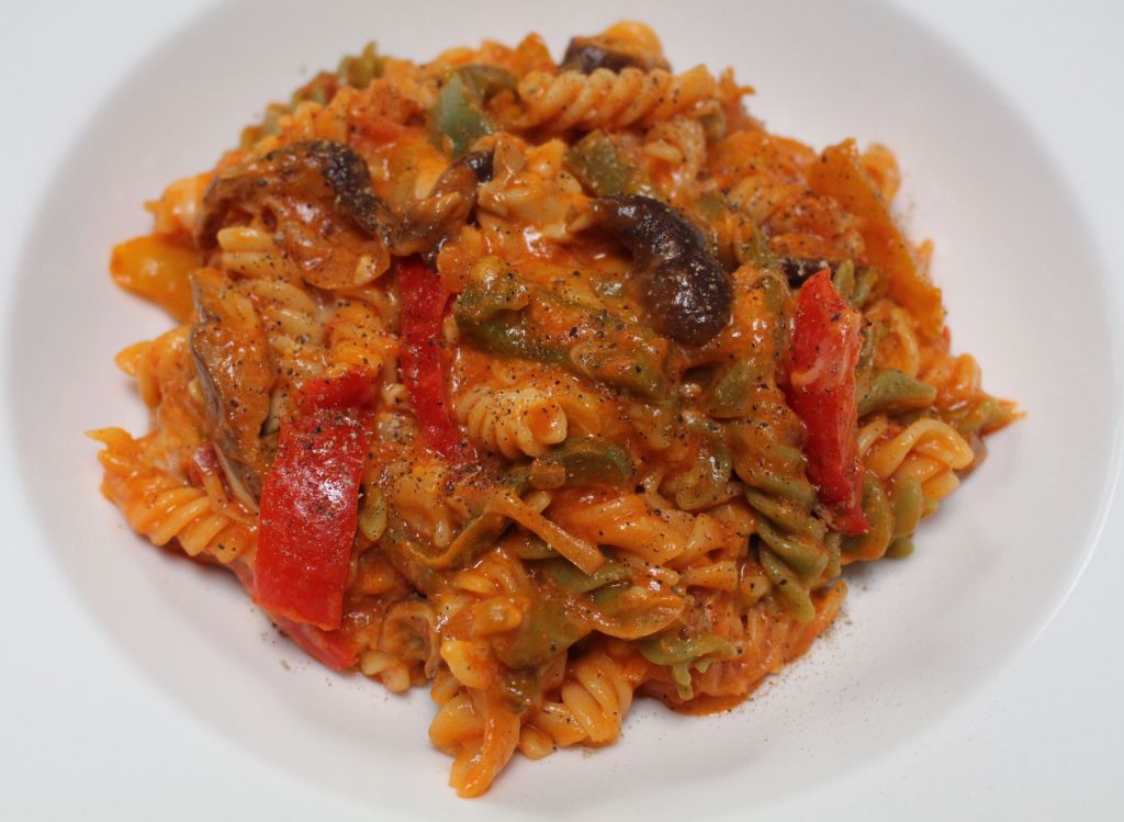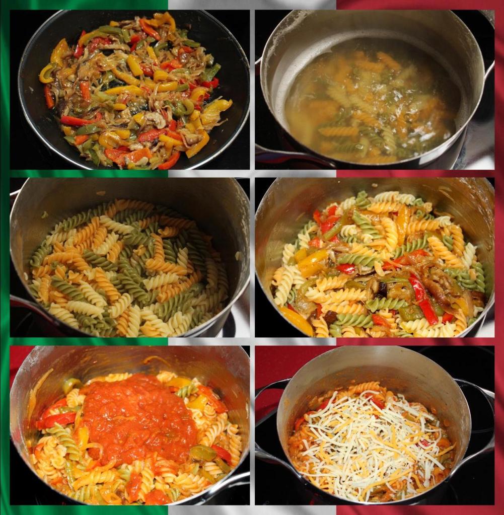 200grs de fusilli tricolor, 3 pimientos tricolor, 2 cebolletas, setas shiitake, salsa de tomate, salsa mexicana para fajitas, cordero (o vuestra carne favorita), queso rallado, agua, sal y pimienta negra.