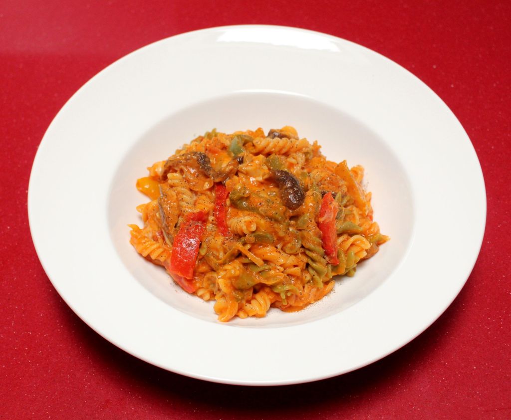 La receta simple de hoy, fusiona las cocinas italiana y mexicana, los colores de sus banderas se trasladan al plato con estos fusilli tricolore subidos de tono con una mezcla de pimientos también tricolor.