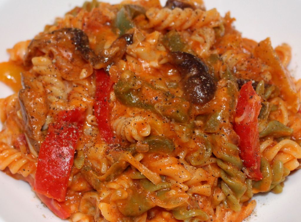 Tenía unos sobrantes de cordero asado y la primera idea junto con unas setas y los pimientos, era preparar unas fajitas con unas tortillas de maíz. A media receta rebuscando ingredientes aparecieron los fusilli tricolore, por qué no fusionarlos.