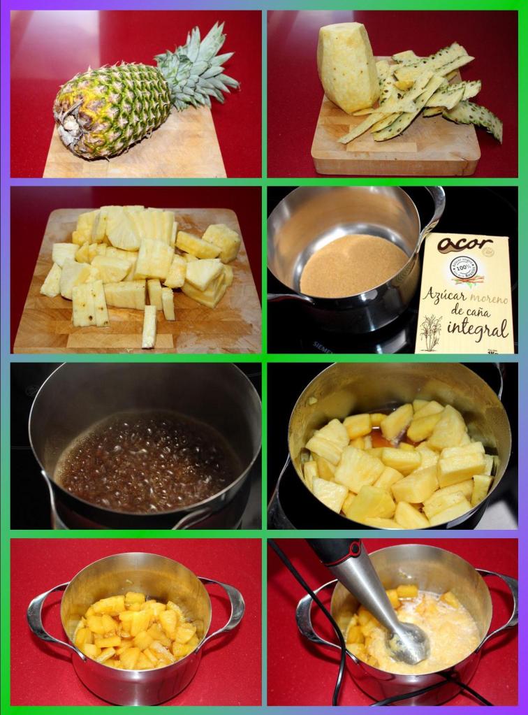 Por tiempos de espera, comenzaremos con la espuma de piña puesto que lo optimo sería tenerla 24h en el refrigerador. Pelamos la piña, eliminamos el tronco central, partimos en trozos medianos. En una cacerola ponemos a calentar el azúcar y el agua hasta formar un almíbar, añadimos la piña hasta que se deshaga, trituramos, pasamos por un colador de malla fina.