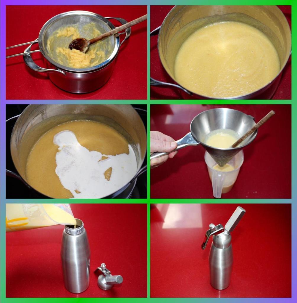 Pasamos la crema de piña a una cacerola, añadimos la nata y llevamos a ebullición. Retiramos, atemperamos y rellenamos un sifón con un par de cargas. Reposamos las 24h en la nevera.
