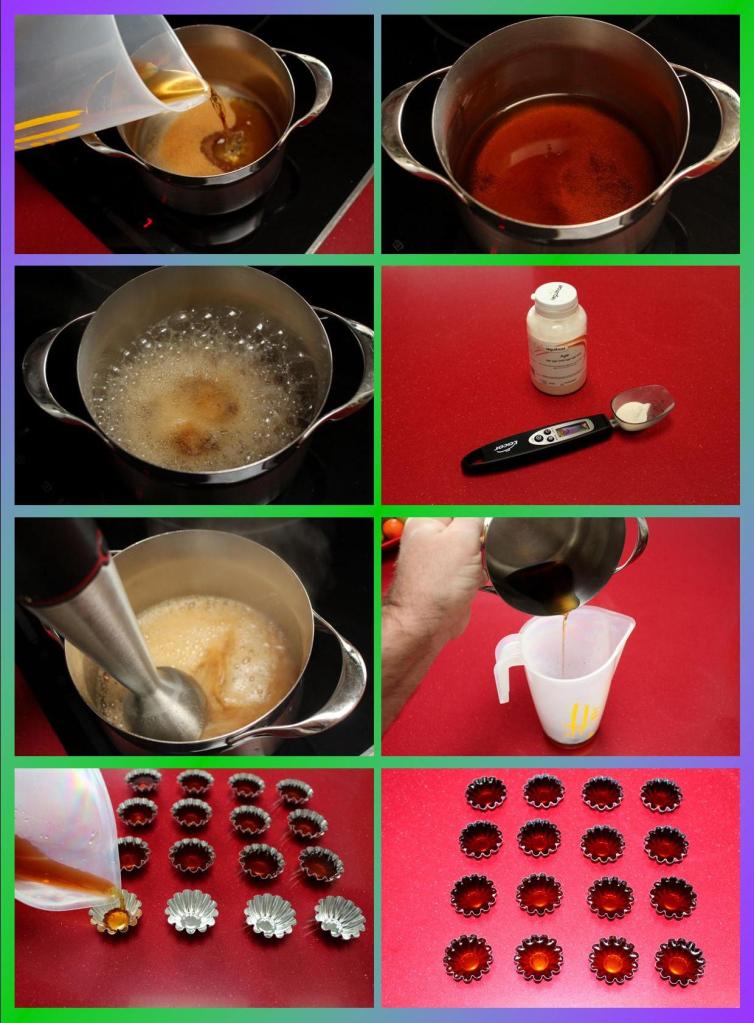 Seguimos con la gelatina. En un cazo hervimos el ron con el azúcar, agregamos el agar, trituramos para mezclar bien, llevamos a ebullición un par de minutos. Llenamos los moldes y refrigeramos.