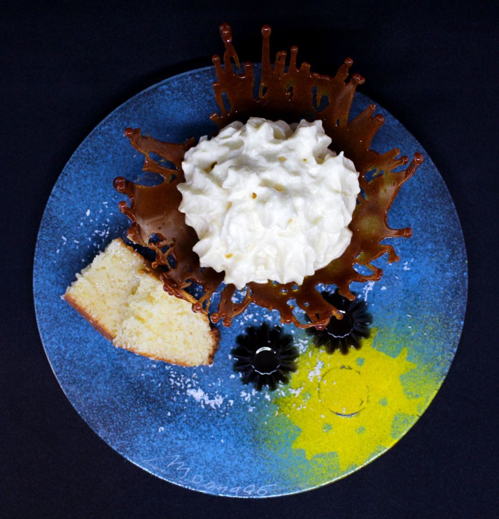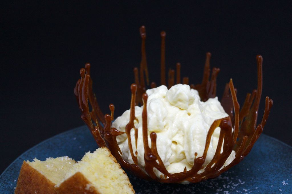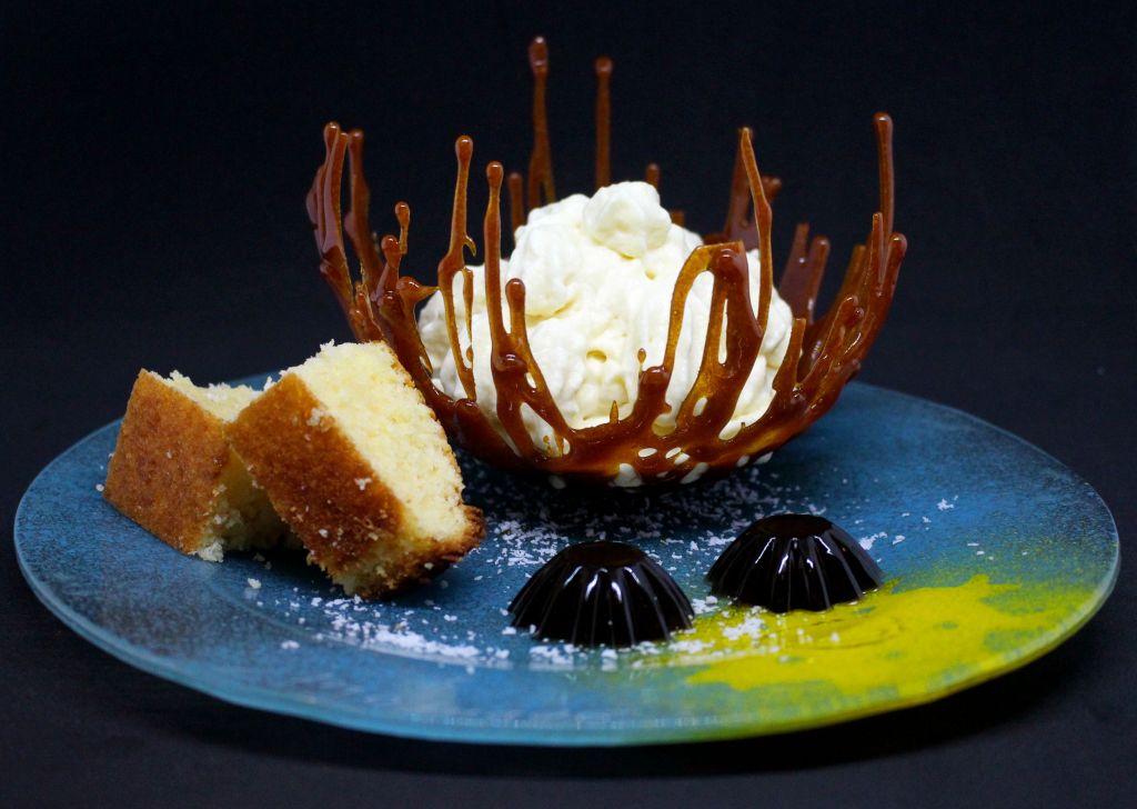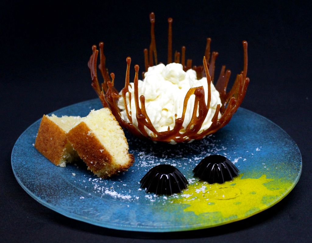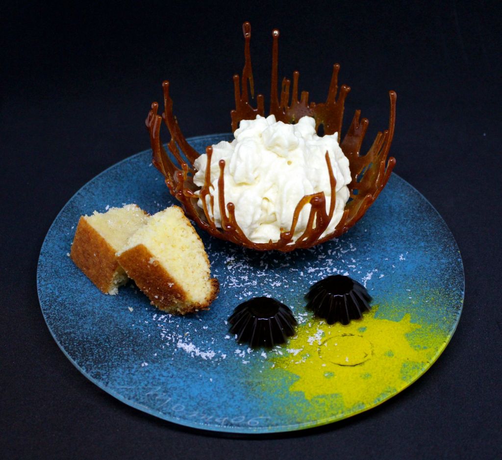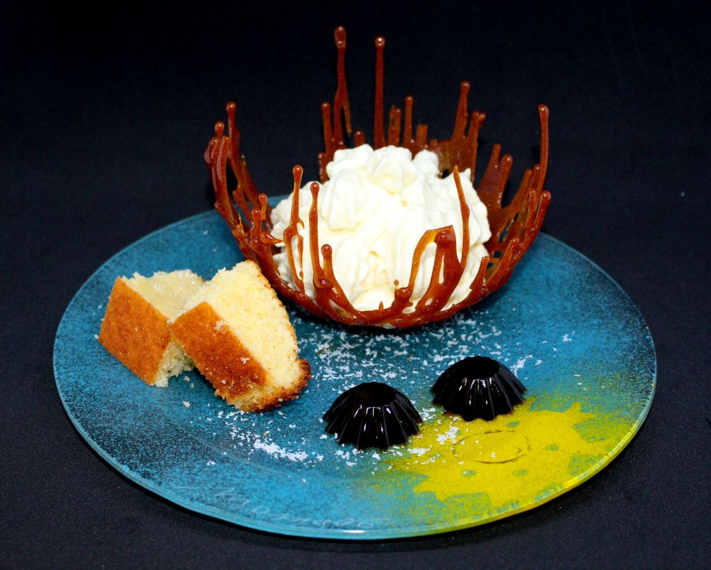Para el postre tenía que tomar cada ingrediente por separado y presentarlo de manera atractiva manteniendo la esencia de sabores pero aplicando diferentes técnicas. La piña va en formato espuma, el coco se integra en un bizcocho de yogur que va ligeramente emborrachado y el ron lo presento en forma de gelatina, todo ello embebido en una estructura frágil de caramelo.