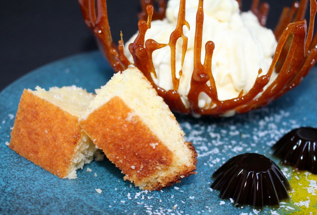 Reposado el bizcocho cortaremos en las porciones que vayamos a servir. En una cacerola pequeña calentamos la leche de coco, el ron avainillado y el azúcar, llevamos a ebullición, reposamos y con una cuchara de postre iremos poco a poco emborrachando los trozos de bizcocho sin excedernos.