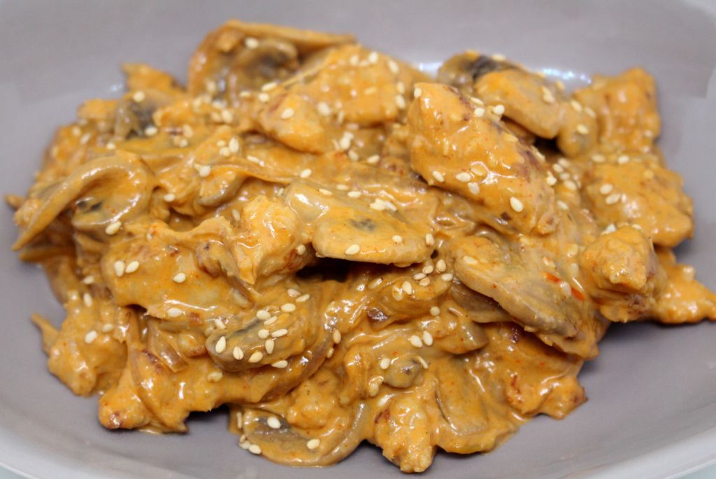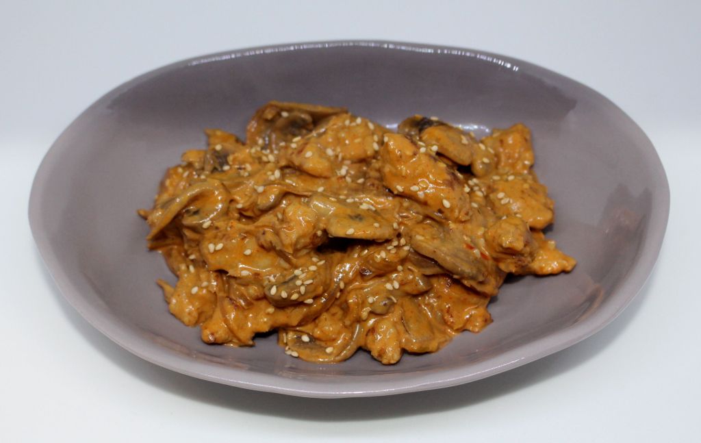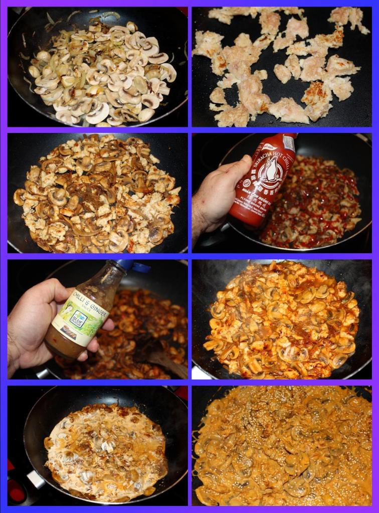 A continuación hacemos el pollo, cuando este bien dorado incorporamos el pochado de cebolla y champiñones. Regamos con abundante salsa sriracha y no demasiada chili ginger. Agregamos un poco de agua y llevamos a ebullición, finalmente ponemos la nata, removemos todo y pasamos a fuego fuerte hasta que todo quede bien ligado y la salsa tenga una buena consistencia cremosa.