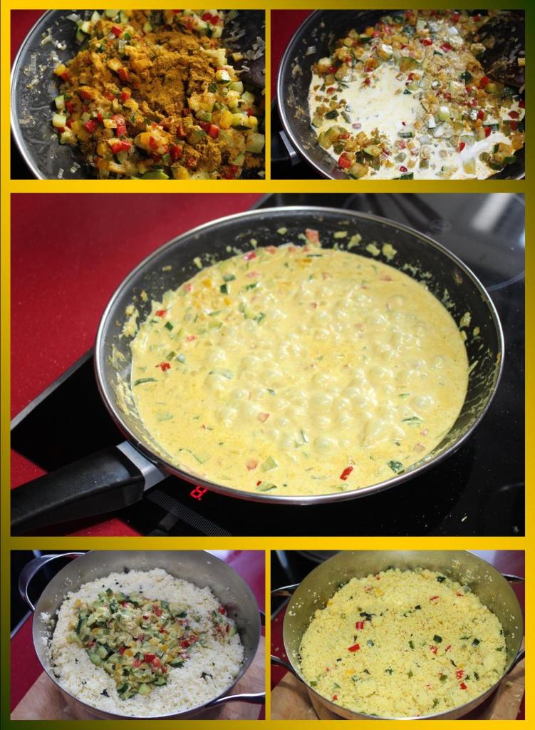 Cuando estén las verduras listas, le añadimos una buena cantidad de ras al hanout, la nata y en mi caso un poco de caldo de cordero pues serviría de acompañamiento para una caldereta de cordero. Llevamos a fuego fuerte, reducimos un poco y volcamos sobre la sémola, volvemos integrar todo con la ayuda de un tenedor y ya estará listo para servir.
