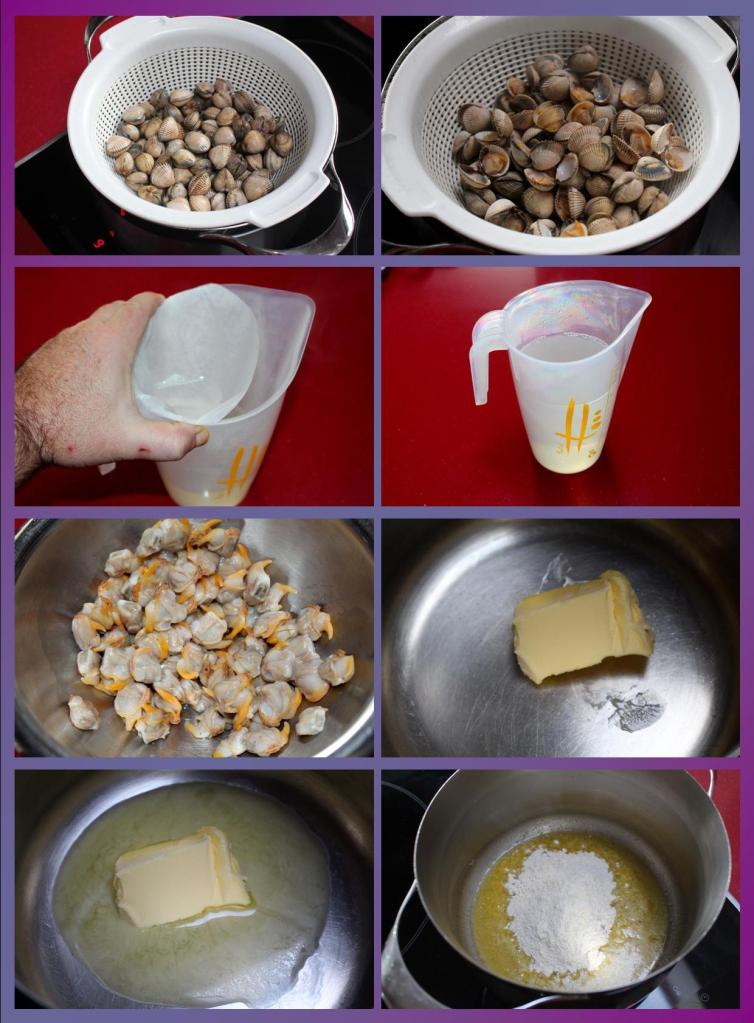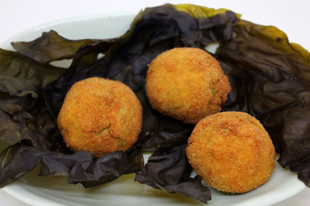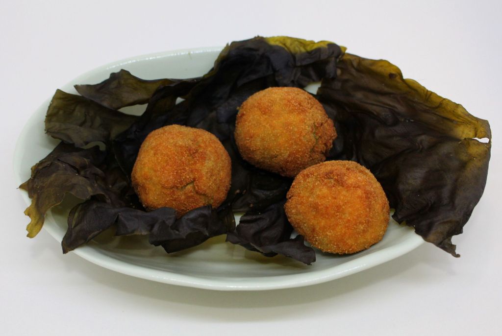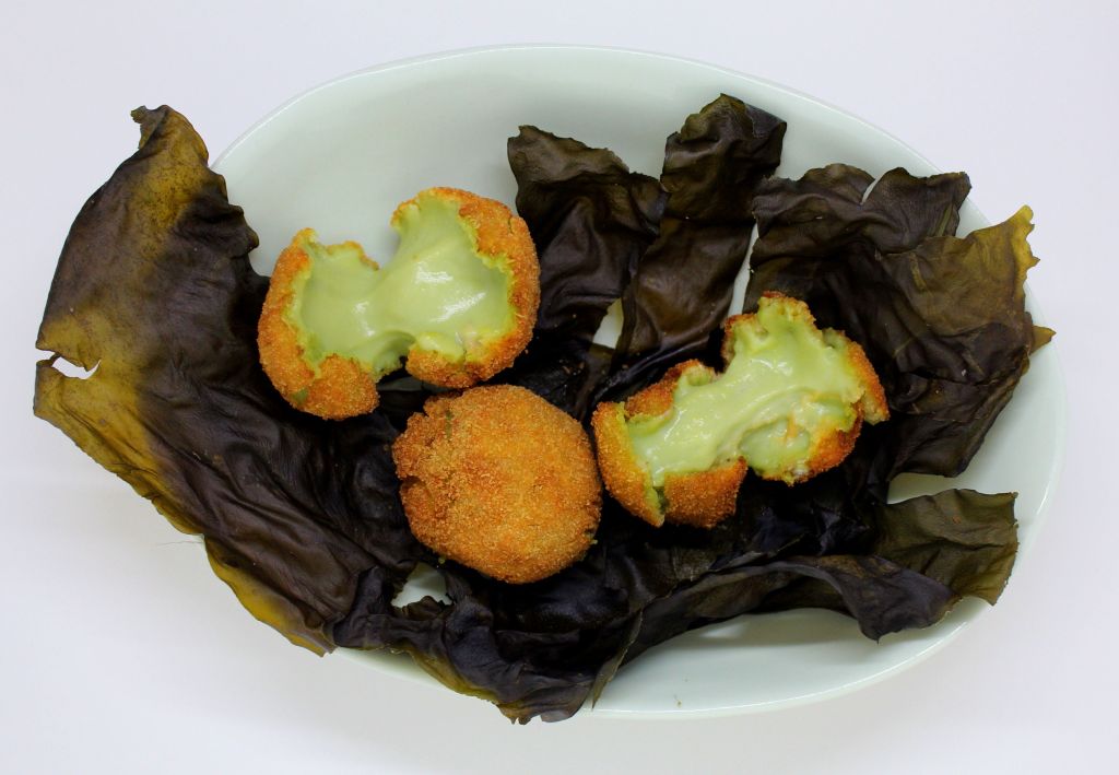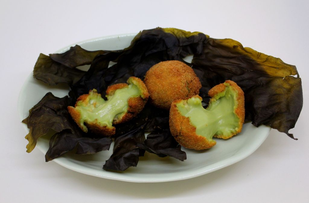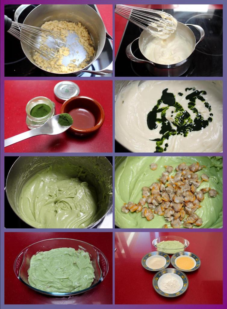 Berberechos, 1gr de plancton marino, mantequilla, harina, leche entera, huevo, pan rallado, sal y AOVE.