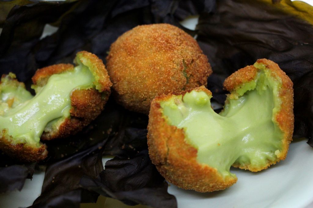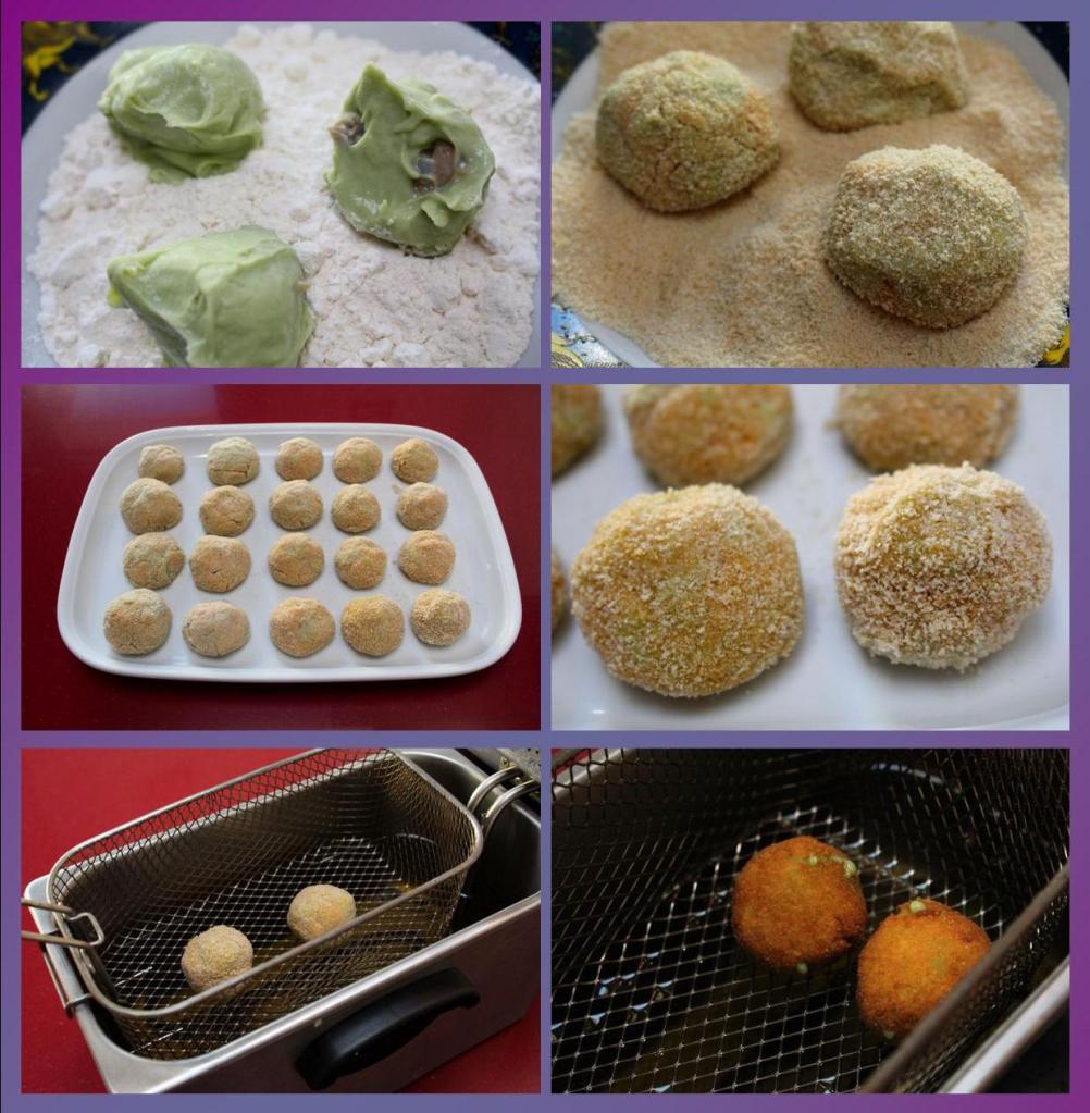 Tomamos porciones con una cuchara de postre, pasamos por harina, luego por huevo y finalmente por pan rallado. Repetimos el paso del huevo y un nuevo rebozo de pan, reservamos hasta que vayamos a freir. Un pequeño truco es meterlas en el congelador durante 5 minutos antes de meterlas en la freidora que ha de tener el aceite a 180º, de esta manera nos aseguramos que queden bien selladas y el interior quede caliente y fundido.