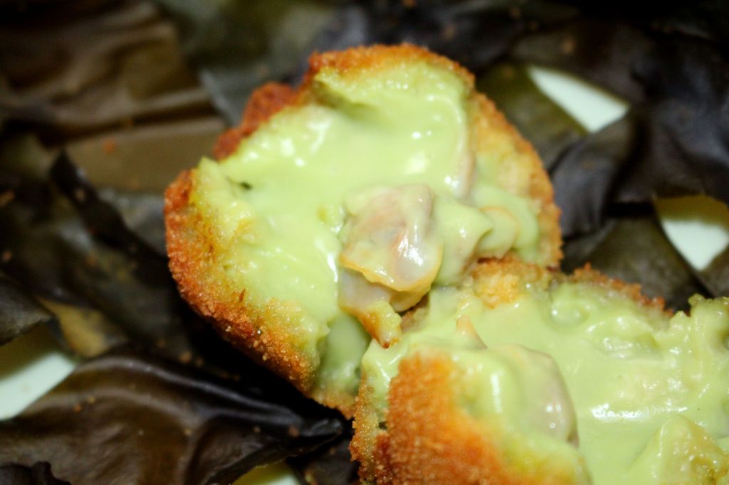Para complementar, como si de jamón se tratase, los tropezones son de berberechos, un molusco bivalvo que por tamaño y sabor se adapta perfectamente a una receta de croquetas. Si por ejemplo, utilizásemos mejillones, habría que picarlos y perdería ese efecto dramático de encontrarse el bicho entero.
