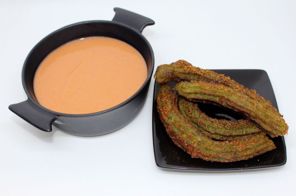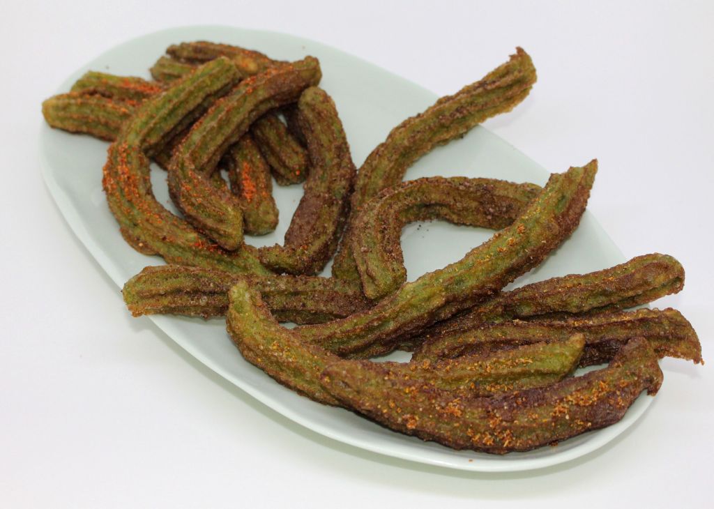 La masa de los churros es salada en su composición y esto me hizo pensar que no necesariamente debía embadurnarlos con azúcar. Uno de los pensamientos fue utilizar té matcha y seguir con una versión tipo postre, pero el plancton marino adquirió más fuerza pensando en que los podía terminar con chile piquín.