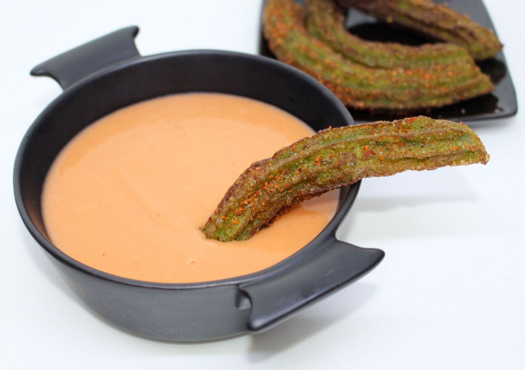Los churros solemos mojarlos en chocolate así que busqué algo acorde. La primera idea fue un mole, que por color y temática mexicana hubiese funcionado de maravilla, pero no lo tenía y no quería hacer uno casero (lleva muchísimo tiempo).