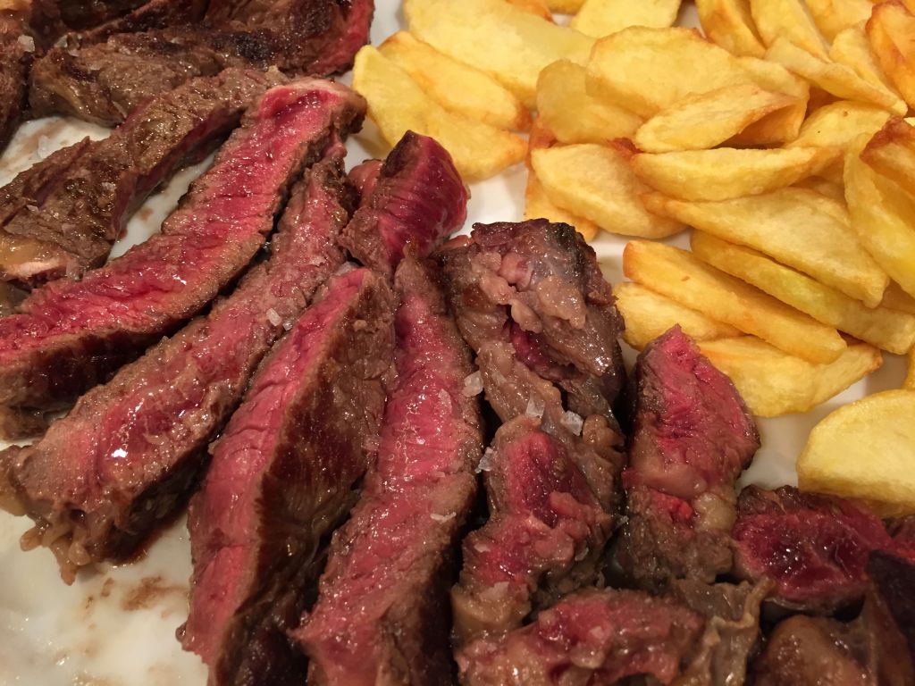 Entrecot de buey con patatas fritas y pimientos confitados. Ya, ya se que no es buey, nadie me ha engañado, porque cobrando 20€ es suficiente razón para que lo supiese al pedirlo. Lo importante, ¿estaba buena la vaca vieja?, pues si, extraordinaria con el punto clavao.