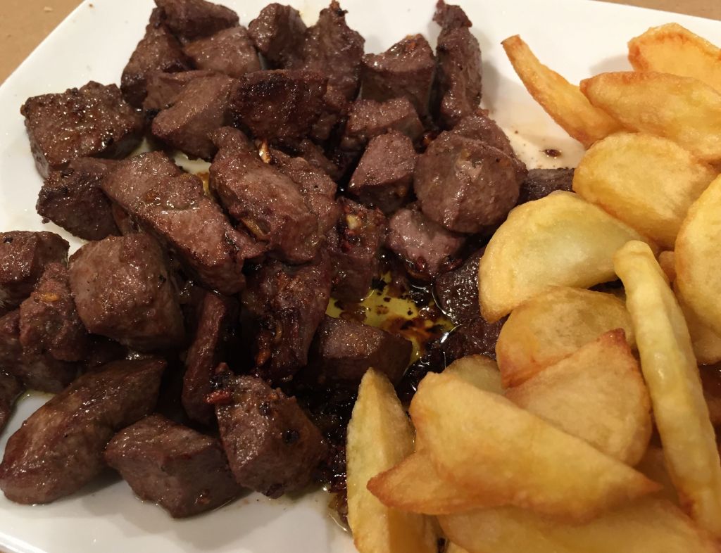 Hígado de ternera al ajillo con patatas fritas. Había bastante expectación pero al final, por unanimidad, nos pareció que estaba demasiado hecho.