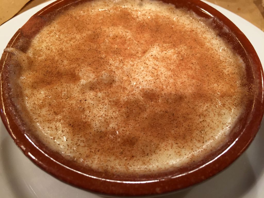 De postre un solitario arroz con leche, con canela. Muy cremoso, supongo que esta hecho con la misma leche fresca de las croquetas, pero demasiado caliente.